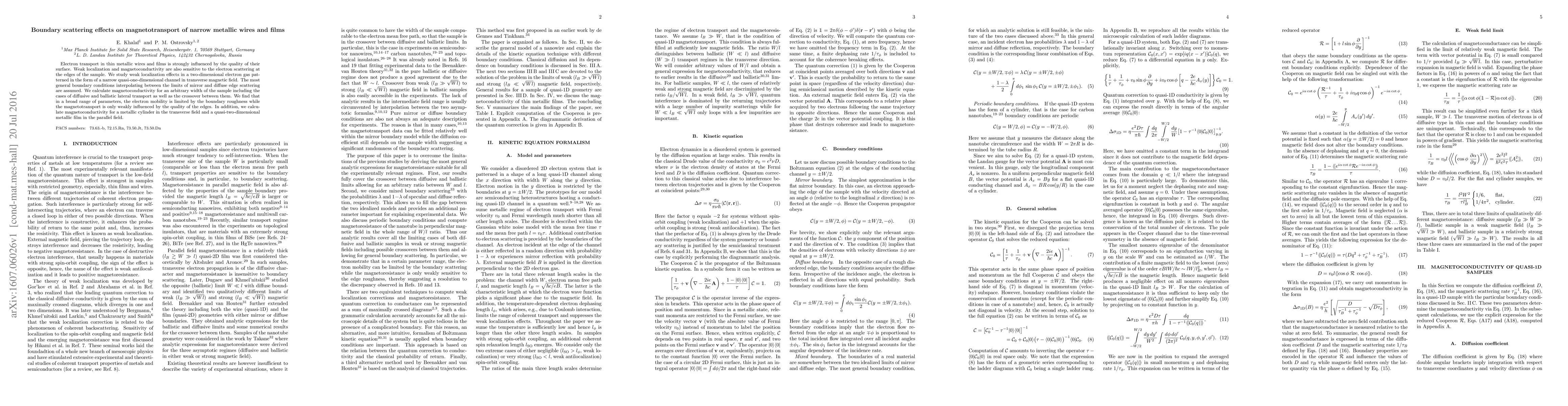 This paper investigates the impact of boundary scattering on the magnetotransport properties of narrow metallic wires and films, finding that electron mobility is primarily constrained by boundary roughness, while magnetotransport is minimally affected by edge scattering quality. The study covers both quasi-one-dimensional channels and two-dimensional electron gases under various magnetic field configurations.