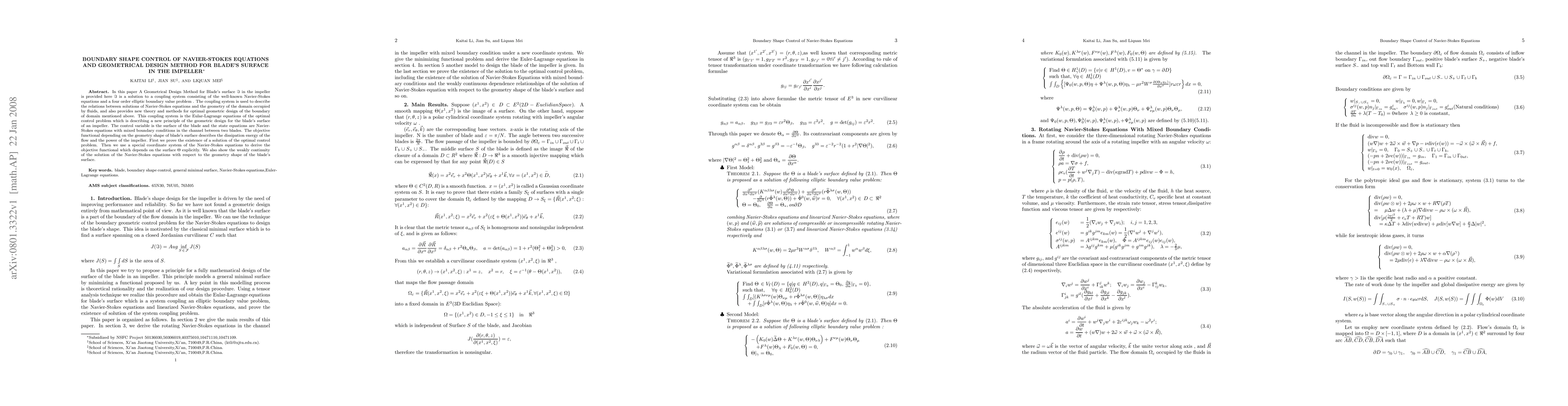 In this paper A Geometrical Design Method for Blade's surface $\Im$ in the impeller is provided here $\Im$ is a solution to a coupling system consisting of the well-known Navier-Stokes equations and a four order elliptic boundary value problem . The coupling system is used to describe the relations between solutions of Navier-Stokes equations and the geometry of the domain occupied by fluids, and also provides new theory and methods for optimal geometric design of the boundary of domain mentioned above. This coupling system is the Eular-Lagrange equations of the optimal control problem which is describing a new principle of the geometric design for the blade's surface of an impeller. The control variable is the surface of the blade and the state equations are Navier-Stokes equations with mixed boundary conditions in the channel between two blades. The objective functional depending on the geometry shape of blade's surface describes the dissipation energy of the flow and the power of the impeller. First we prove the existence of a solution of the optimal control problem. Then we use a special coordinate system of the Navier-Stokes equations to derive the objective functional which depends on the surface $\Theta$ explicitly. We also show the weakly continuity of the solution of the Navier-Stokes equations with respect to the geometry shape of the blade's surface.