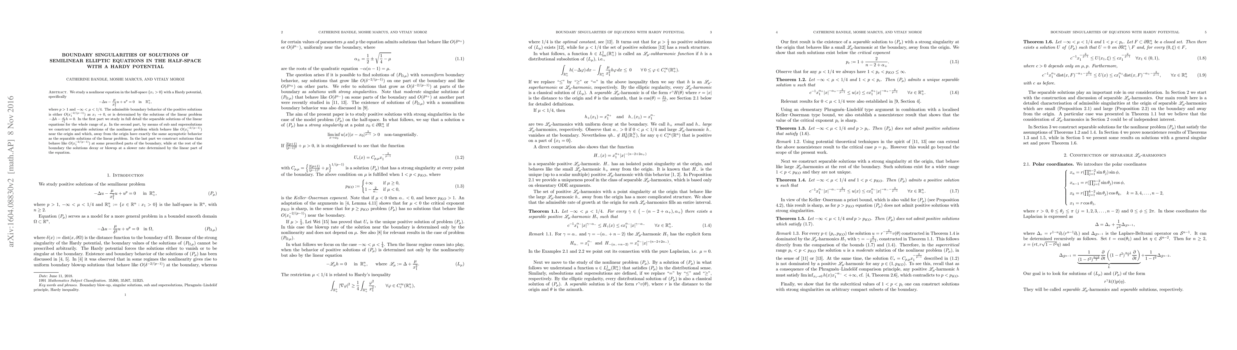 We study a nonlinear equation in the half-space $\{x_1>0\}$ with a Hardy potential, specifically \[-\Delta u -\frac{\mu}{x_1^2}u+u^p=0\quad\text{in}\quad \mathbb R^n_+,\] where $p>1$ and $-\infty<\mu<1/4$. The admissible boundary behavior of the positive solutions is either $O(x_1^{-2/(p-1)})$ as $x_1\to 0$, or is determined by the solutions of the linear problem $-\Delta h -\frac{\mu}{x_1^2}h=0$. In the first part we study in full detail the separable solutions of the linear equations for the whole range of $\mu$. In the second part, by means of sub and supersolutions we construct separable solutions of the nonlinear problem which behave like $O(x_1^{-2/(p-1)})$ near the origin and which, away from the origin have exactly the same asymptotic behavior as the separable solutions of the linear problem. In the last part we construct solutions that behave like $O(x_1^{-2/(p-1)})$ at some prescribed parts of the boundary, while at the rest of the boundary the solutions decay or blowup at a slower rate determined by the linear part of the equation.