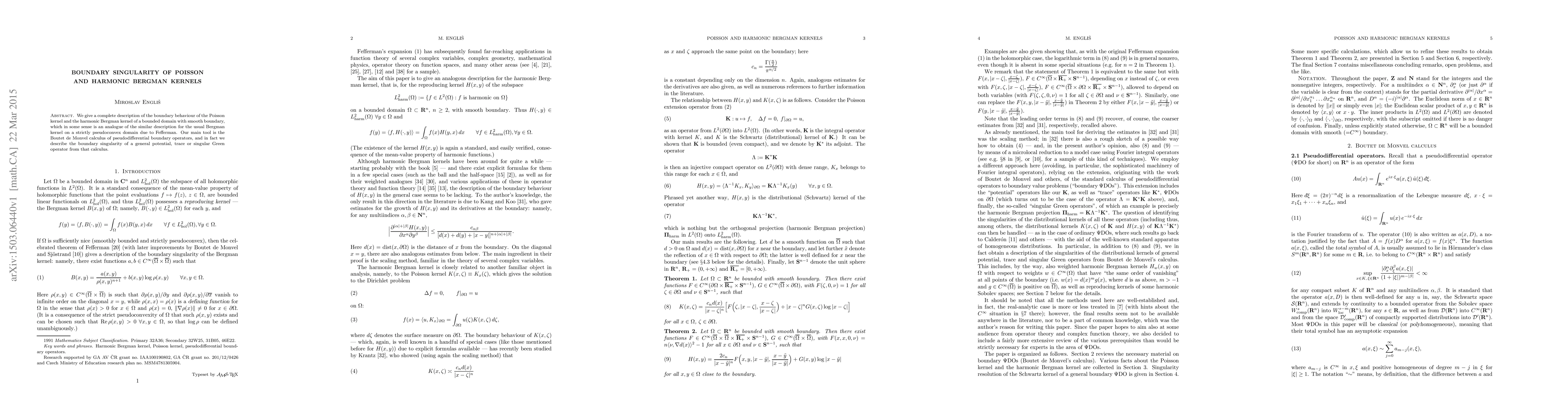 Researchers describe the boundary behavior of Poisson and harmonic Bergman kernels in bounded domains with smooth boundaries, building on a framework for pseudodifferential operators.