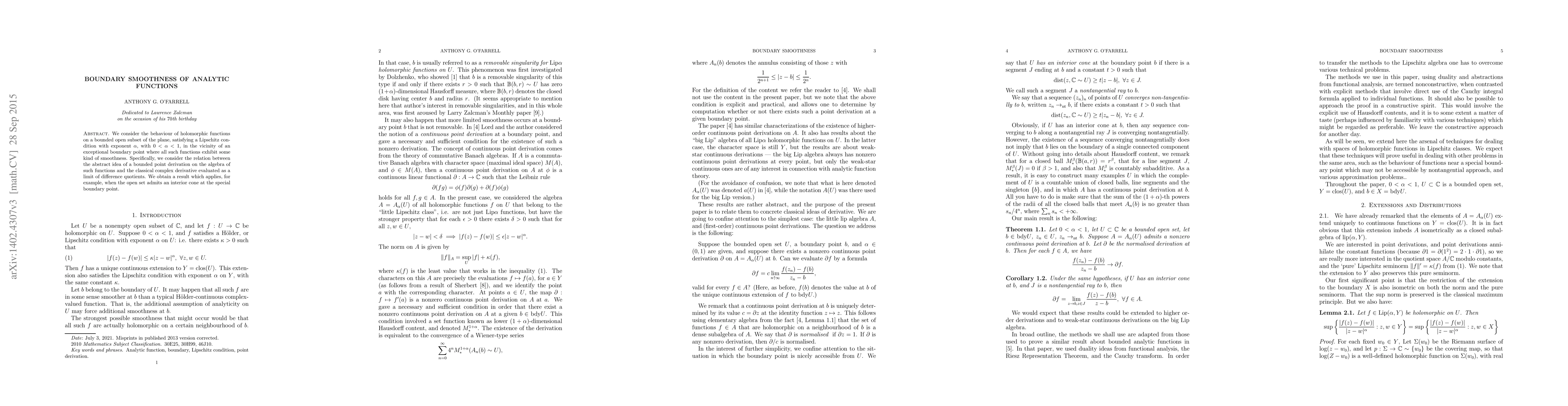 We consider the behaviour of holomorphic functions on a bounded open subset of the plane, satisfying a Lipschitz condition with exponent $\alpha$, with $0<\alpha<1$, in the vicinity of an exceptional boundary point where all such functions exhibit some kind of smoothness. Specifically, we consider the relation between the abstract idea of a bounded point derivation on the algebra of such functions and the classical complex derivative evaluated as a limit of difference quotients. We obtain a result which applies, for example, when the open set admits an interior cone at the special boundary point.