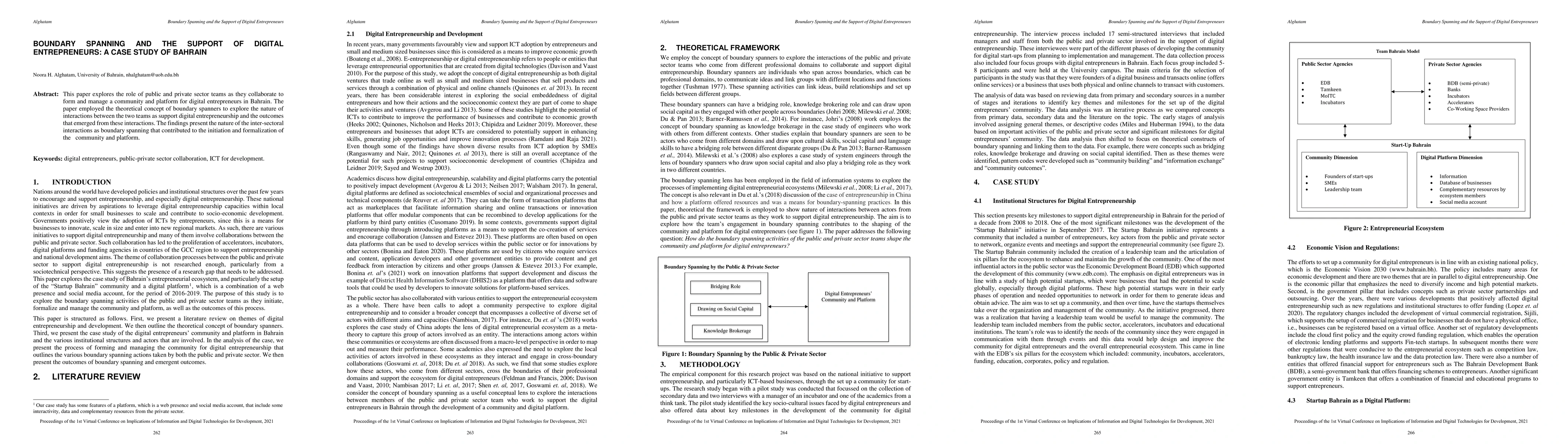 This paper explores the role of public and private sector teams as they collaborate to form and manage a community and platform for digital entrepreneurs in Bahrain. The paper employed the theoretical concept of boundary spanners to explore the nature of interactions between the two teams as support digital entrepreneurship and the outcomes that emerged from these interactions. The findings present the nature of the inter-sectoral interactions as boundary spanning that contributed to the initiation and formalization of the community and platform.