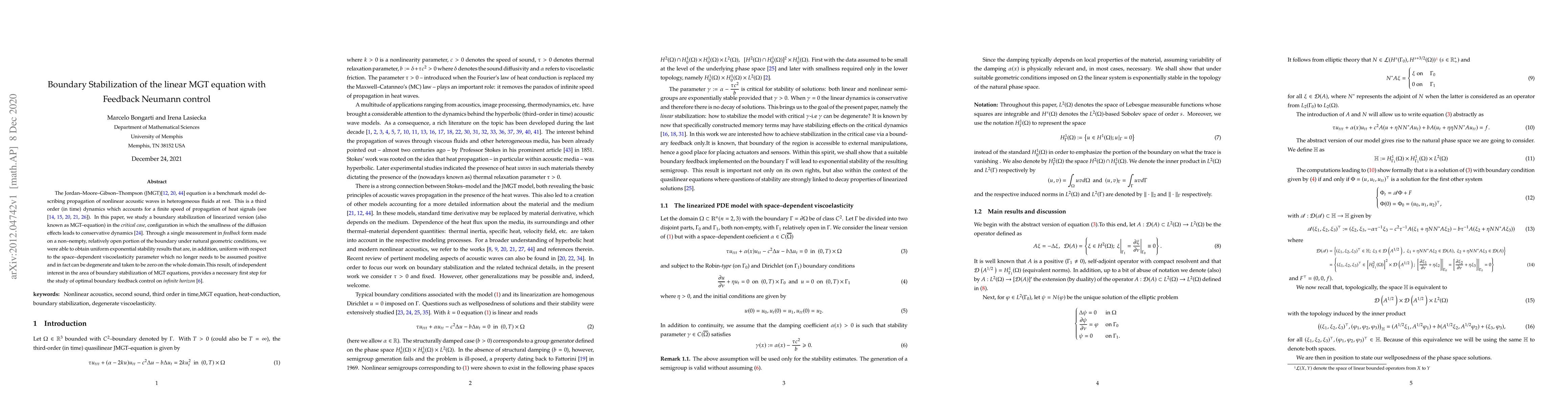 The Jordan-Moore-Gibson-Thompson (JMGT)\cite{christov_heat_2005,jordan_nonlinear_2008,straughan_heat_2014} equation is a benchmark model describing propagation of nonlinear acoustic waves in heterogeneous fluids at rest. This is a third-order (in time) dynamics which accounts for a finite speed of propagation of heat signals (see \cite{coulouvrat_equations_1992,crighton_model_1979,jordan_nonlinear_2008,jordan_second-sound_2014,kaltenbacher_jordan-moore-gibson-thompson_2019}). In this paper, we study a boundary stabilization of linearized version (also known as MGT-equation) in the {\it critical case}, configuration in which the smallness of the diffusion effects leads to conservative dynamics \cite{kaltenbacher_wellposedness_2011}. Through a single measurement in {\it{feedback}} form made on a non-empty, relatively open portion of the boundary under natural geometric conditions, we were able to obtain uniform exponential stability results that are, in addition, uniform with respect to the space-dependent viscoelasticity parameter which no longer needs to be assumed positive and in fact can be degenerate and taken to be zero on the whole domain. This result, of independent interest in the area of boundary stabilization of MGT equations, provides a necessary first step for the study of optimal boundary feedback control on {\it infinite horizon} \cite{bucci_feedback_2019}.