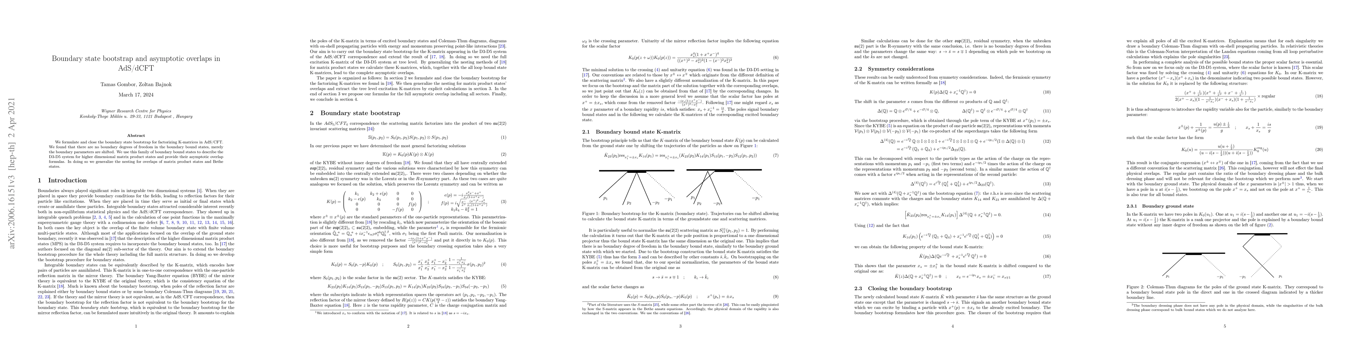 This paper formulates and completes the boundary state bootstrap for factorizing K-matrices in AdS/CFT, revealing that boundary bound states lack degrees of freedom, only shifting boundary parameters. It also provides asymptotic overlap formulas for the D3-D5 system and generalizes nesting for matrix product states and Bethe states.