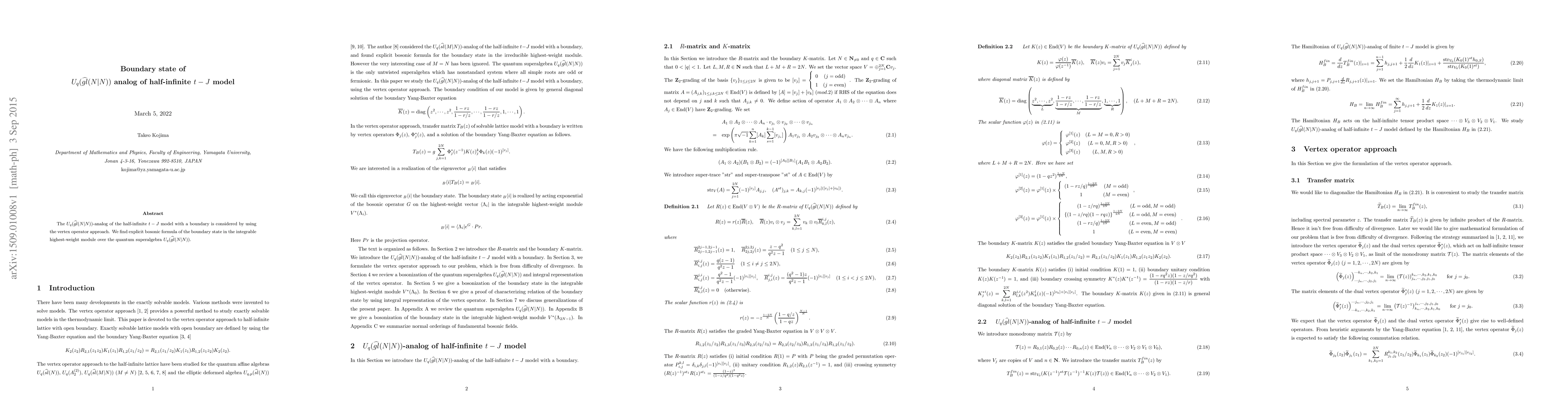 The $U_q(\hat{gl}(N|N))$-analog of the half-infinite $t-J$ model with a boundary is considered by using the vertex operator approach. We find explicit bosonic formula of the boundary state in the integrable highest-weight module over the quantum superalgebra $U_q(\hat{gl}(N|N))$.
