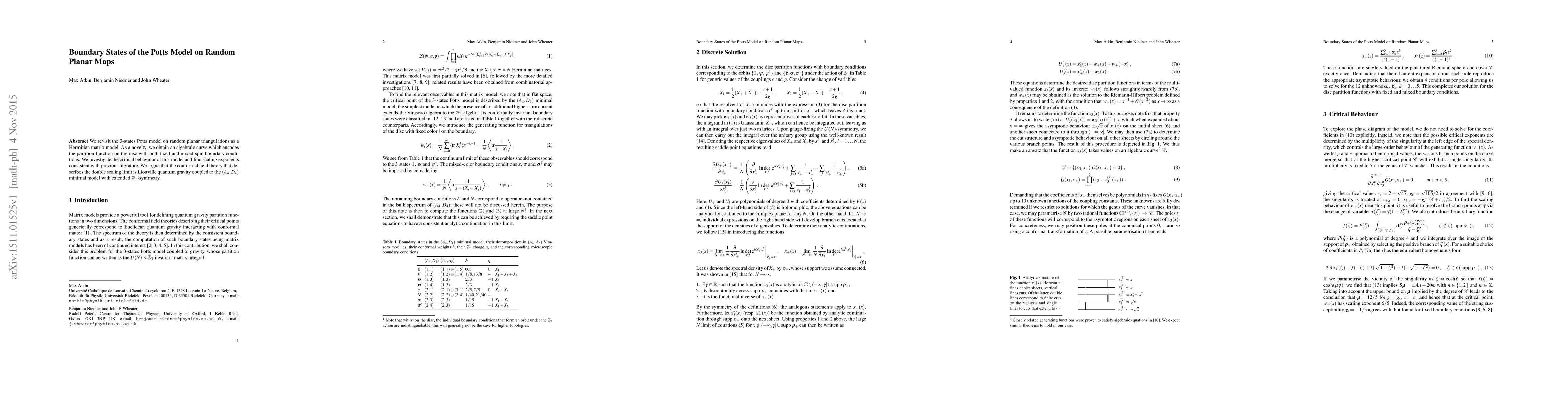 We revisit the 3-states Potts model on random planar triangulations as a Hermitian matrix model. As a novelty, we obtain an algebraic curve which encodes the partition function on the disc with both fixed and mixed spin boundary conditions. We investigate the critical behaviour of this model and find scaling exponents consistent with previous literature. We argue that the conformal field theory that describes the double scaling limit is Liouville quantum gravity coupled to the $(A_4,D_4)$ minimal model with extended $\mathcal{W}_3$-symmetry.