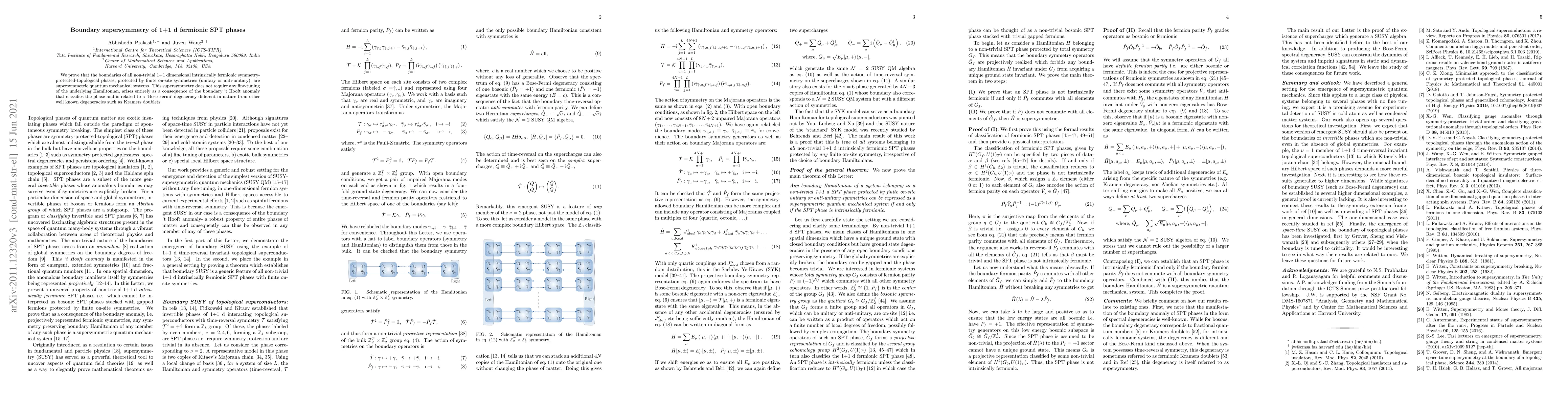 We prove that the boundaries of all non-trivial 1+1 dimensional intrinsically fermionic symmetry-protected-topological phases, protected by finite on-site symmetries (unitary or anti-unitary), are supersymmetric quantum mechanical systems. This supersymmetry does not require any fine-tuning of the underlying Hamiltonian, arises entirely as a consequence of the boundary 't Hooft anomaly that classifies the phase and is related to a `Bose-Fermi' degeneracy different in nature from other well known degeneracies such as Kramers doublets.