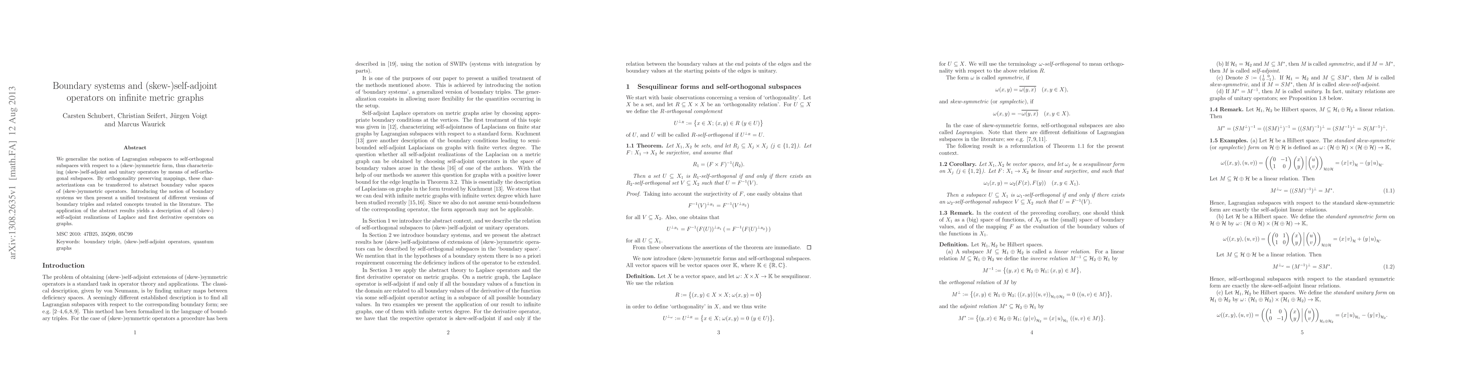 We generalize the notion of Lagrangian subspaces to self-orthogonal subspaces with respect to a (skew-)symmetric form, thus characterizing (skew-)self-adjoint and unitary operators by means of self-ortho-gonal subspaces. By orthogonality preserving mappings, these characterizations can be transferred to abstract boundary value spaces of (skew-)symmetric operators. Introducing the notion of boundary systems we then present a unified treatment of different versions of boundary triples and related concepts treated in the literature. The application of the abstract results yields a description of all (skew-)self-adjoint realizations of Laplace and first derivative operators on graphs.