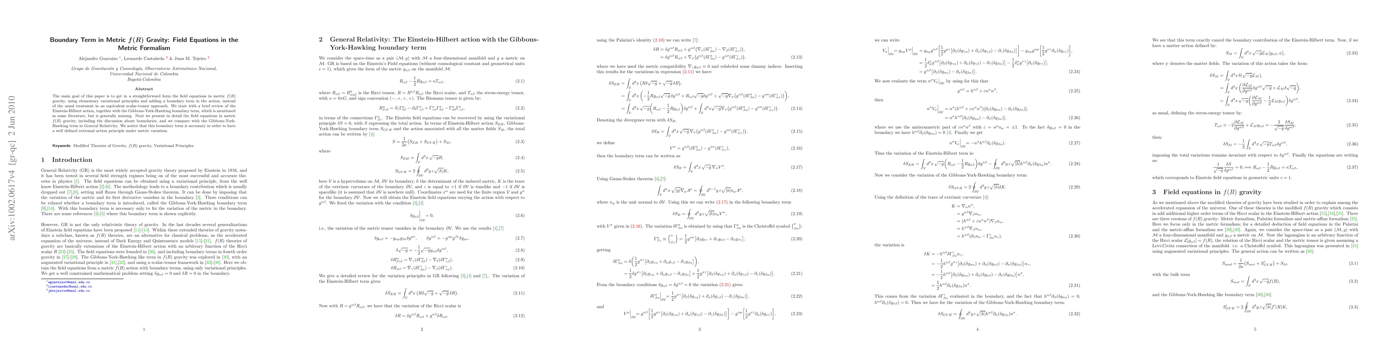 The main goal of this paper is to get in a straightforward form the field equations in metric f(R) gravity, using elementary variational principles and adding a boundary term in the action, instead of the usual treatment in an equivalent scalar-tensor approach. We start with a brief review of the Einstein-Hilbert action, together with the Gibbons-York-Hawking boundary term, which is mentioned in some literature, but is generally missing. Next we present in detail the field equations in metric f(R) gravity, including the discussion about boundaries, and we compare with the Gibbons-York-Hawking term in General Relativity. We notice that this boundary term is necessary in order to have a well defined extremal action principle under metric variation.