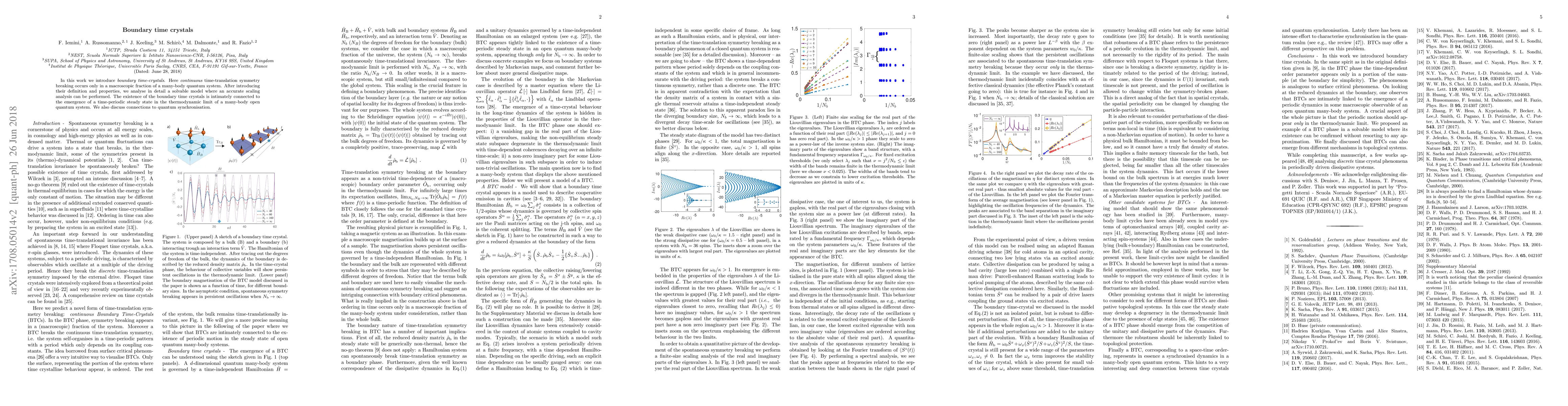 Boundary time crystals exhibit continuous time-translation symmetry breaking in a macroscopic portion of a many-body quantum system, with a detailed analysis of a solvable model revealing a time-periodic steady state in the thermodynamic limit. Connections to quantum synchronization are also explored.