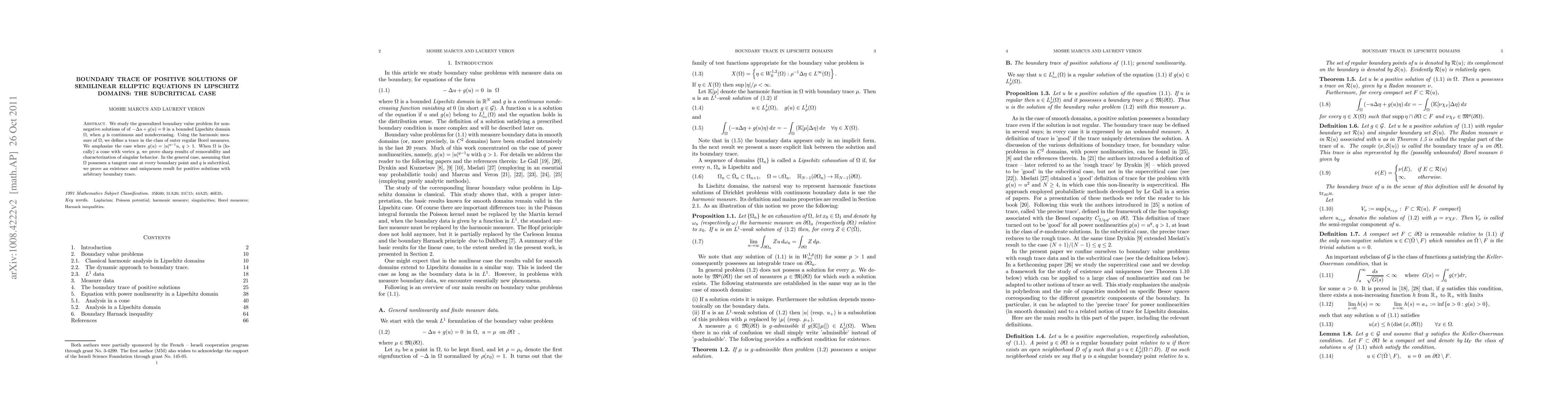 We study the generalized boundary value problem for nonnegative solutions of of $-\Delta u+g(u)=0$ in a bounded Lipschitz domain $\Omega$, when $g$ is continuous and nondecreasing. Using the harmonic measure of $\Omega$, we define a trace in the class of outer regular Borel measures. We amphasize the case where $g(u)=|u|^{q-1}u$, $q>1$. When $\Omega$ is (locally) a cone with vertex $y$, we prove sharp results of removability and characterization of singular behavior. In the general case, assuming that $\Omega$ possesses a tangent cone at every boundary point and $q$ is subcritical, we prove an existence and uniqueness result for positive solutions with arbitrary boundary trace.