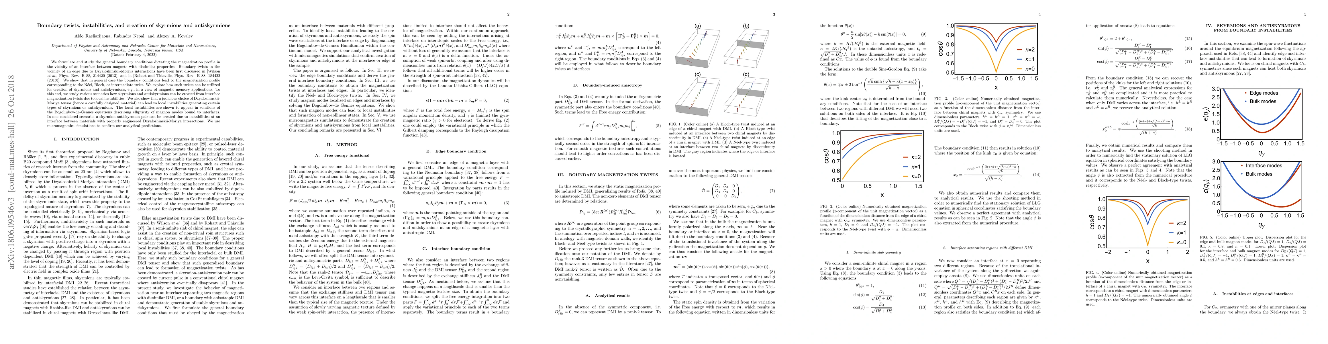 This paper explores the boundary conditions affecting magnetization profiles at the interface between magnets with different properties, focusing on boundary twists due to Dzyaloshinskii-Moriya interactions. It investigates how these twists can generate skyrmions and antiskyrmions through local instabilities, potentially useful for magnetic memory applications, and confirms findings with micromagnetics simulations.