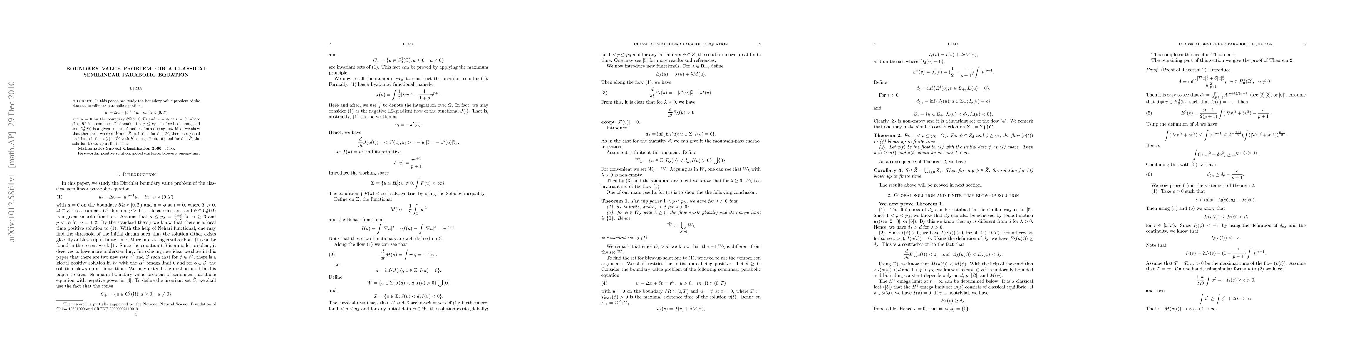 In this paper, we study the boundary value problem of the classical semilinear parabolic equations $$ u_t-\Delta u=|u|^{p-1}u, \ \ in \ \ \Omega\times (0,T) $$ and $u=0$ on the boundary $\partial\Omega\times [0,T)$ and $u=\phi$ at $t=0$, where $\Omega\subset R^n$ is a compact $C^1$ domain, $1