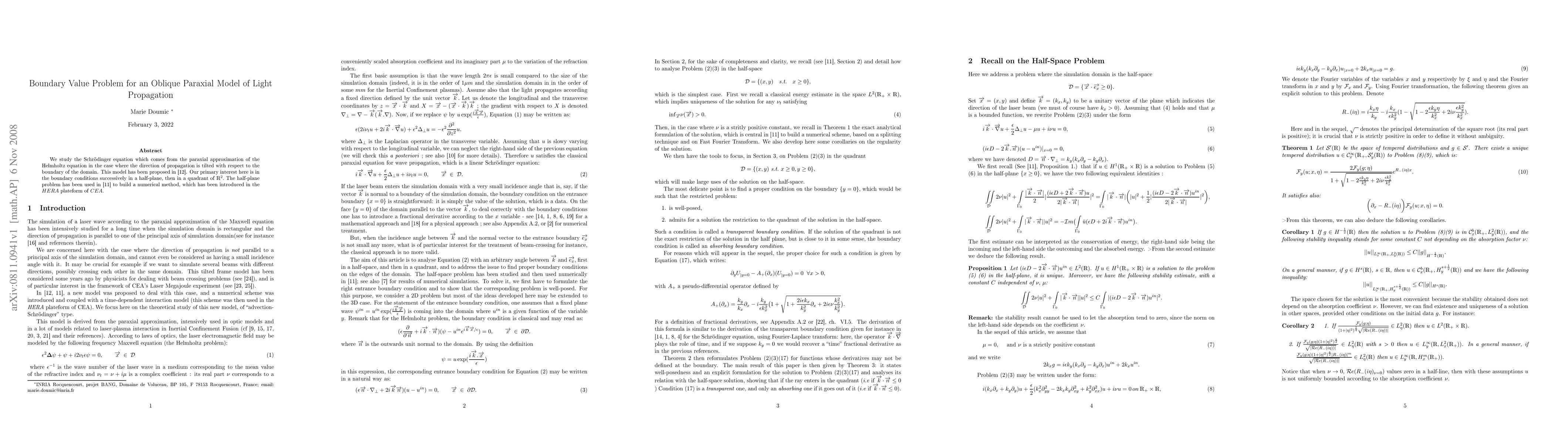 We study the Schr\"odinger equation which comes from the paraxial approximation of the Helmholtz equation in the case where the direction of propagation is tilted with respect to the boundary of the domain. This model has been proposed in (Doumic, Golse, Sentis, CRAS, 2003). Our primary interest here is in the boundary conditions successively in a half-plane, then in a quadrant of R2. The half-plane problem has been used in (Doumic, Duboc, Golse, Sentis, JCP, to appear) to build a numerical method, which has been introduced in the HERA plateform of CEA.