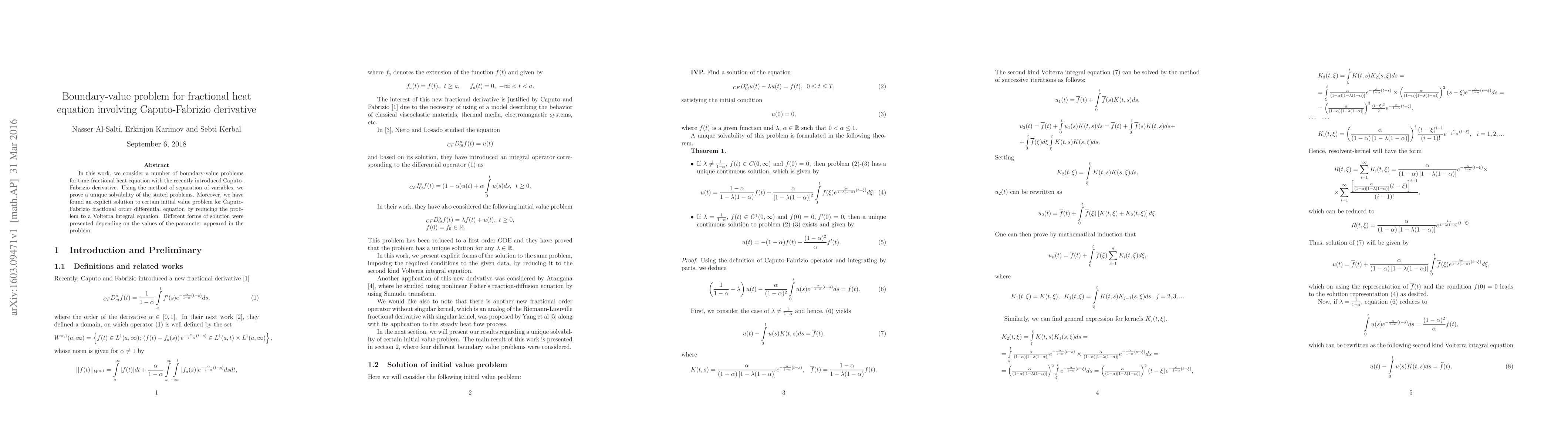 This research investigates boundary-value problems for a time-fractional heat equation employing the Caputo-Fabrizio derivative. The authors utilize separation of variables to demonstrate unique solvability and derive an explicit solution via a Volterra integral equation.