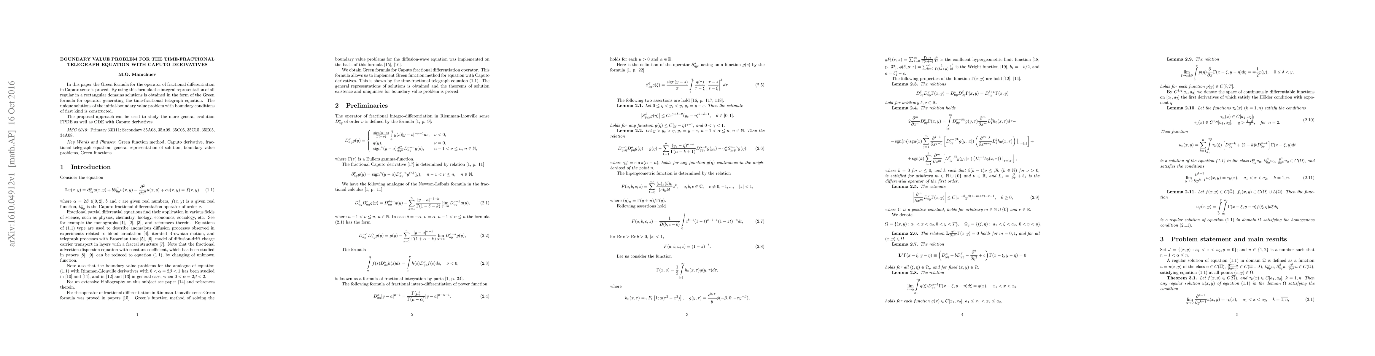 In this paper the Green formula for the operator of fractional differentiation in Caputo sense is proved. By using this formula the integral representation of all regular in a rectangular domains solutions is obtained in the form of the Green formula for operator generating the time-fractional telegraph equation. The unique solutions of the initial-boundary value problem with boundary conditions of first kind is constructed. The proposed approach can be used to study the more general evolution FPDE as well as ODE with Caputo derivatives.