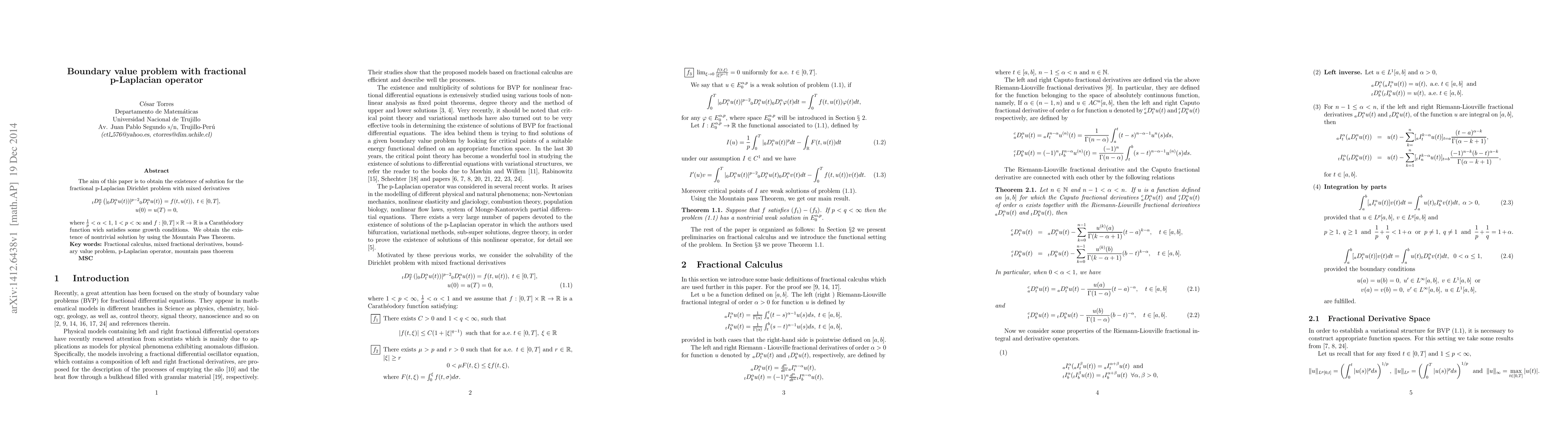 The aim of this paper is to obtain the existence of solution for the fractional p-Laplacian Dirichlet problem with mixed derivatives \begin{eqnarray*} &{_{t}}D_{T}^{\alpha}\left(|_{0}D_{t}^{\alpha}u(t))|^{p-2}{_{0}}D_{t}^{\alpha}u(t)\right) = f(t,u(t)), \;t\in [0,T],\\ &u(0) = u(T) = 0, \end{eqnarray*} where $\frac{1}{p} < \alpha <1$, $1