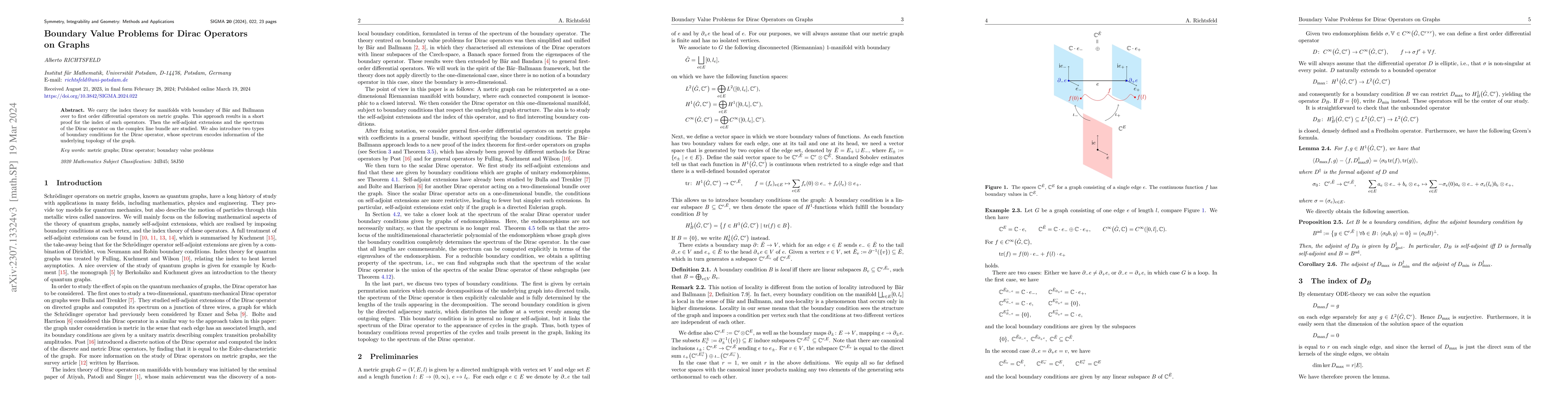This paper extends index theory from manifolds to metric graphs, providing a concise proof for the index of Dirac operators. It studies self-adjoint extensions and spectra of Dirac operators on line bundles, introducing two boundary conditions that reflect the graph's topology.