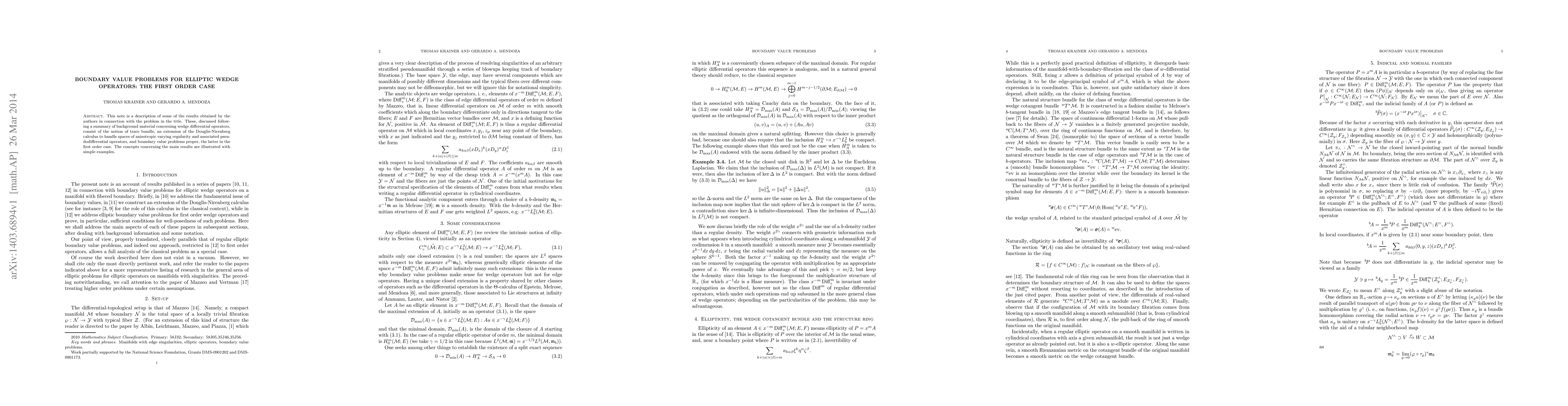 This paper discusses boundary value problems for elliptic wedge operators focusing on the first-order case, introducing trace bundles and extending the Douglis-Nirenberg calculus to manage spaces of varying regularity. Illustrative examples are provided to clarify the main results.