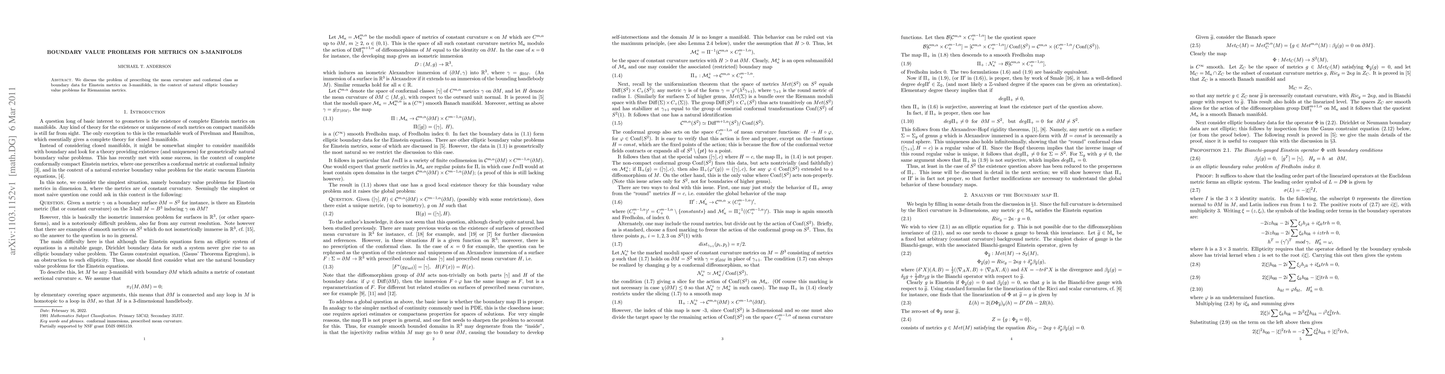 This paper addresses the challenge of determining Einstein metrics on 3-manifolds given boundary conditions that prescribe mean curvature and conformal class, framed within the broader context of elliptic boundary value problems for Riemannian metrics.