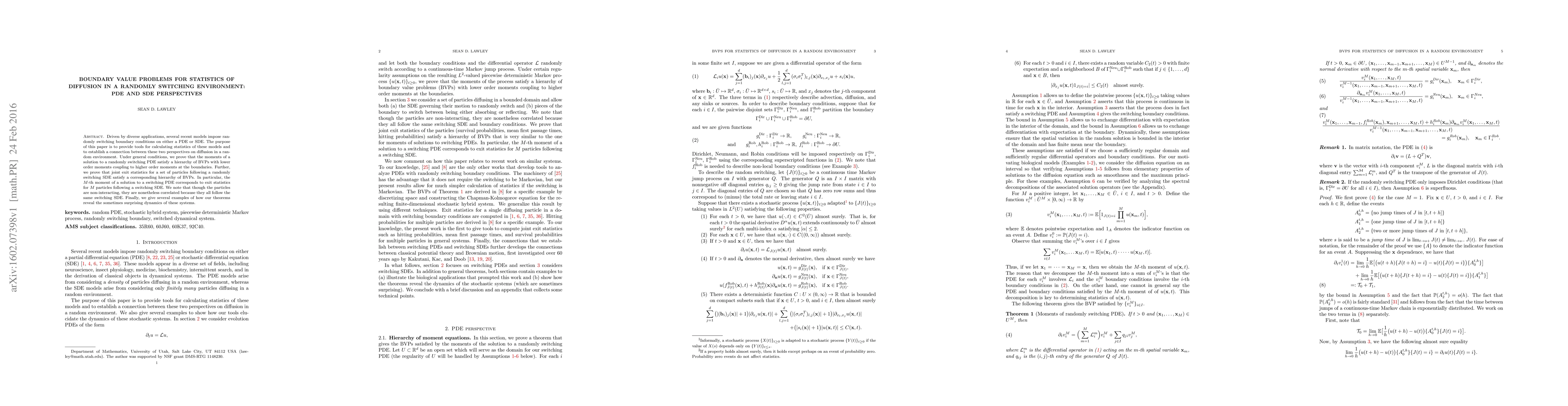 Driven by diverse applications, several recent models impose randomly switching boundary conditions on either a PDE or SDE. The purpose of this paper is to provide tools for calculating statistics of these models and to establish a connection between these two perspectives on diffusion in a random environment. Under general conditions, we prove that the moments of a solution to a randomly switching PDE satisfy a hierarchy of BVPs with lower order moments coupling to higher order moments at the boundaries. Further, we prove that joint exit statistics for a set of particles following a randomly switching SDE satisfy a corresponding hierarchy of BVPs. In particular, the $M$-th moment of a solution to a switching PDE corresponds to exit statistics for $M$ particles following a switching SDE. We note that though the particles are non-interacting, they are nonetheless correlated because they all follow the same switching SDE. Finally, we give several examples of how our theorems reveal the sometimes surprising dynamics of these systems.