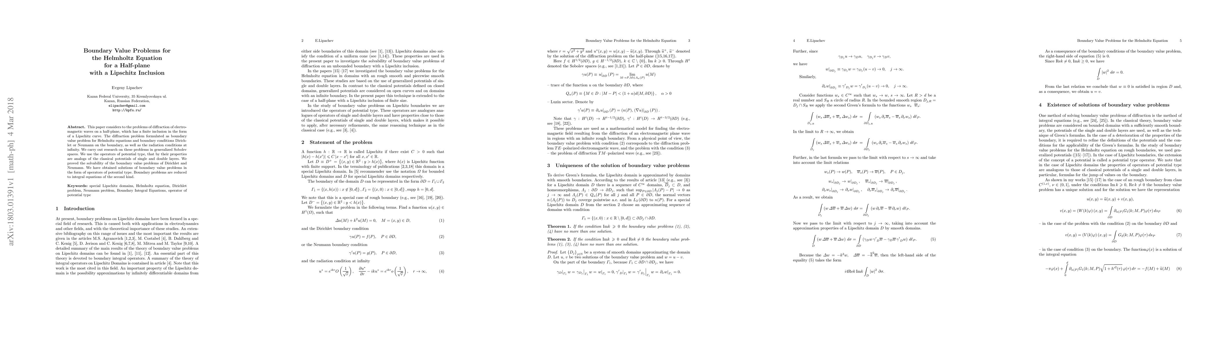 This paper considers to the problems of diffraction of electromagnetic waves on a half-plane, which has a finite inclusion in the form of a Lipschitz curve. The diffraction problem formulated as boundary value problem for Helmholtz equations and boundary conditions Dirichlet or Neumann on the boundary, as well as the radiation conditions at infinity. We carry out research on these problems in generalized Sobolev spaces. We use the operators of potential type, that by their properties are analogs of the classical potentials of single and double layers. We proved the solvability of the boundary value problems of Dirichlet and Neumann. We have obtained solutions of boundary value problems in the form of operators of potential type. Boundary problems are reduced to integral equations of the second kind.