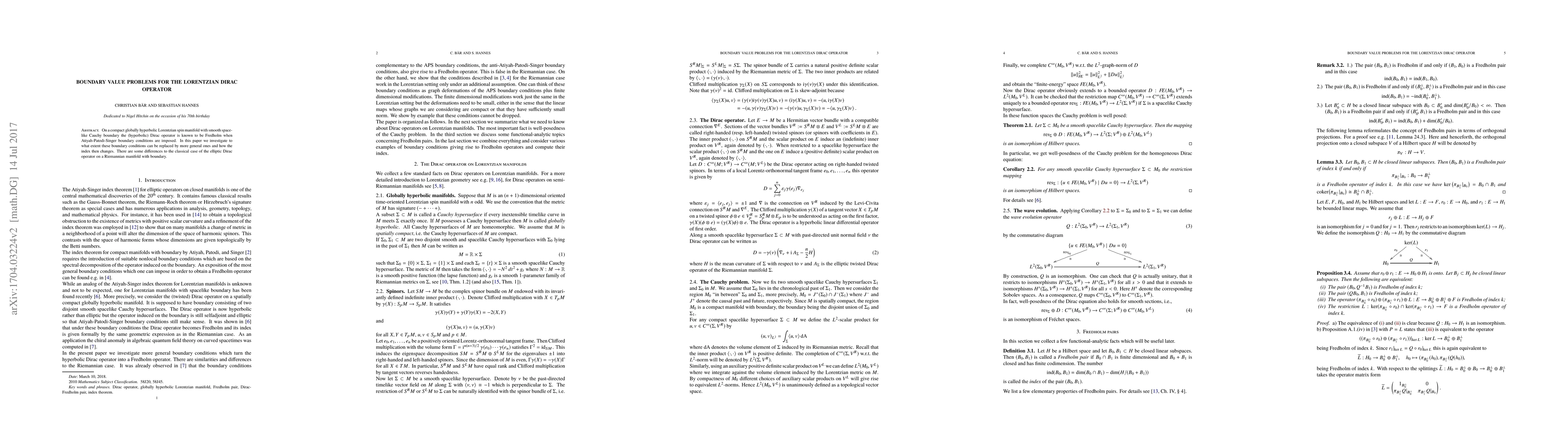 This paper explores the Fredholm properties of the hyperbolic Dirac operator on a compact Lorentzian spin manifold under various boundary conditions, comparing the index changes to the classical elliptic Dirac operator on a Riemannian manifold. It highlights differences arising from the Lorentzian setting.