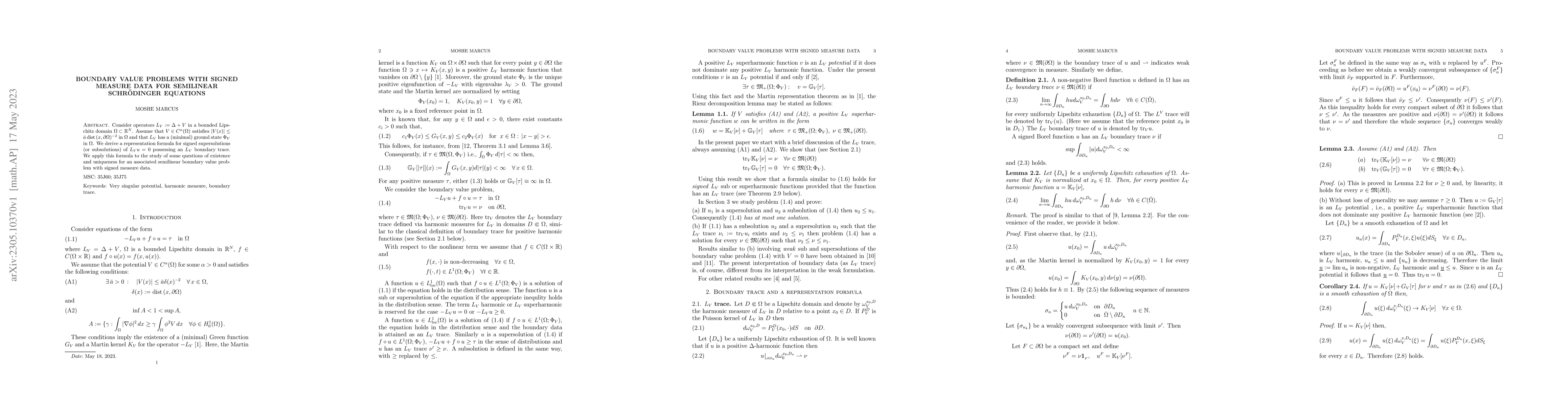 This paper derives a representation formula for signed supersolutions or subsolutions of the semilinear Schrödinger equation $L_Vu=0$ in a bounded Lipschitz domain, and applies this to investigate existence and uniqueness for associated boundary value problems with signed measure data.