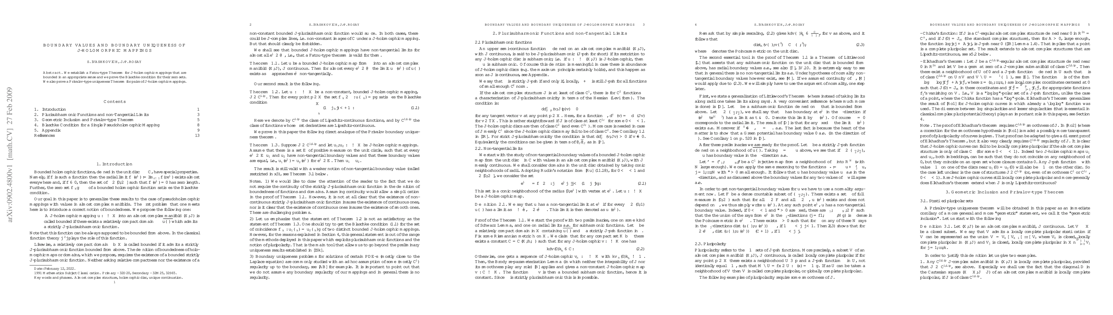 We establish a Fatou-type Theorem for $J$-holomorphic mappings that are bounded in an appropriate sense and we prove the Blaschke condition for their zero sets. We also prove a Privalov-type uniqueness Theorem for pairs of $J$-holomorphic mappings.