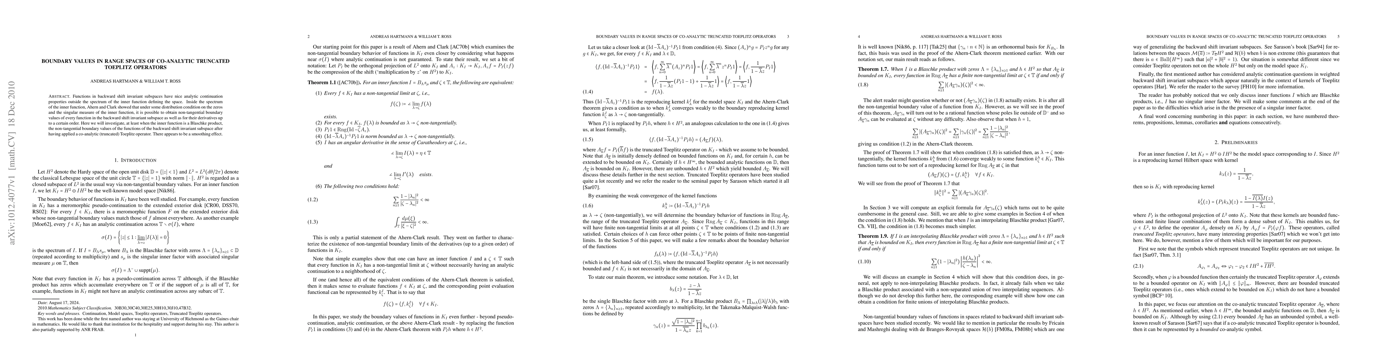 Functions in backward shift invariant subspaces have nice analytic continuation properties outside the spectrum of the inner function defining the space. Inside the spectrum of the inner function, Ahern and Clark showed that under some distribution condition on the zeros and the singular measure of the inner function, it is possible to obtain non-tangential boundary values of every function in the backward shift invariant subspace as well as for their derivatives up to a certain order. Here we will investigate, at least when the inner function is a Blaschke product, the non-tangential boundary values of the functions of the backward shift invariant subspace after having applied a co-analytic (truncated) Toeplitz operator. There appears to be a smoothing effect.