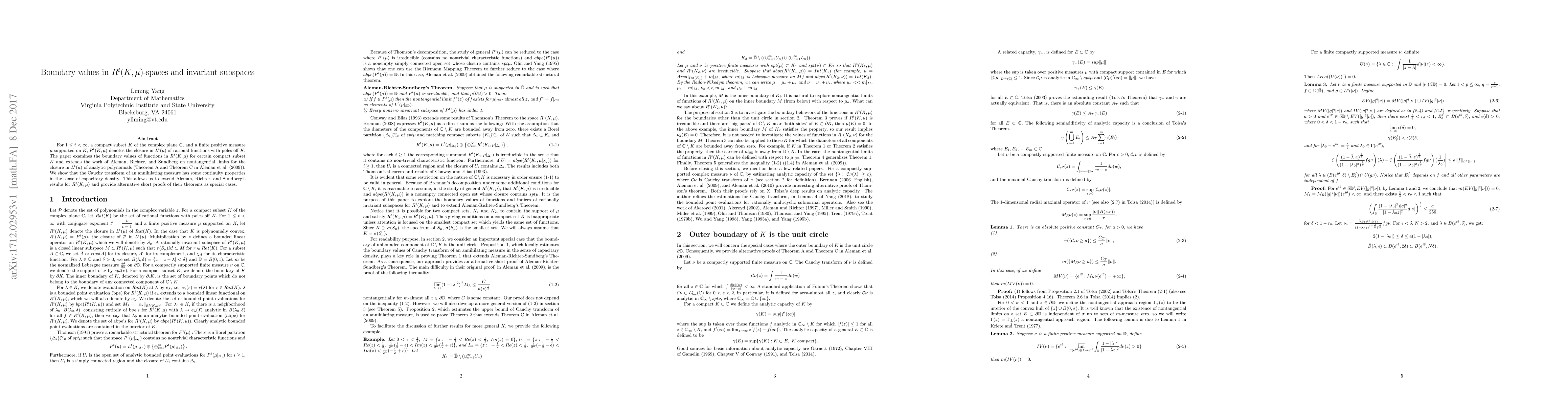 For $1 \le t < \infty ,$ a compact subset $K$ of the complex plane $\mathbb C,$ and a finite positive measure $\mu$ supported on $K,$ $R^t(K, \mu)$ denotes the closure in $L^t (\mu )$ of rational functions with poles off $K.$ The paper examines the boundary values of functions in $R^t(K, \mu)$ for certain compact subset $K$ and extends the work of Aleman, Richter, and Sundberg on nontangential limits for the closure in $L^t (\mu )$ of analytic polynomials (Theorem A and Theorem C in \cite{ars}). We show that the Cauchy transform of an annihilating measure has some continuity properties in the sense of capacitary density. This allows us to extend Aleman, Richter, and Sundberg's results for $R^t(K, \mu)$ and provide alternative short proofs of their theorems as special cases.