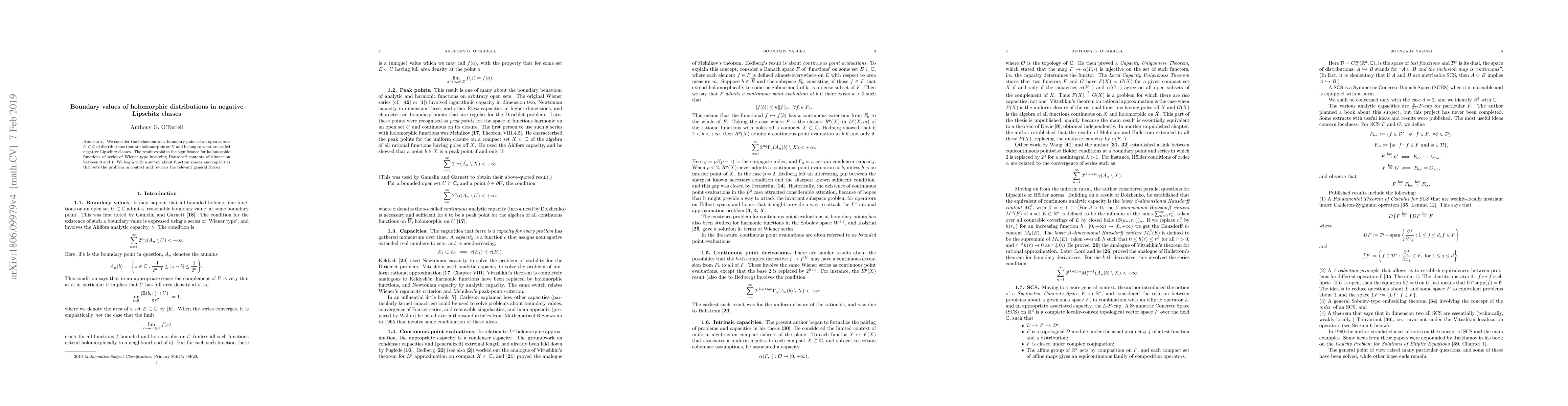 We consider the behaviour at a boundary point of an open subset $U\subset\mathbb{C}$ of distributions that are holomorphic on $U$ and belong to what are called negative Lipschitz classes. The result explains the significance for holomorphic functions of series of Wiener type involving Hausdorff contents of dimension between $0$ and $1$. We begin with a survey about function spaces and capacities that sets the problem in context and reviews the relevant general theory. The techniques used include the construction of a special partition of the identity that may be of independent interest.