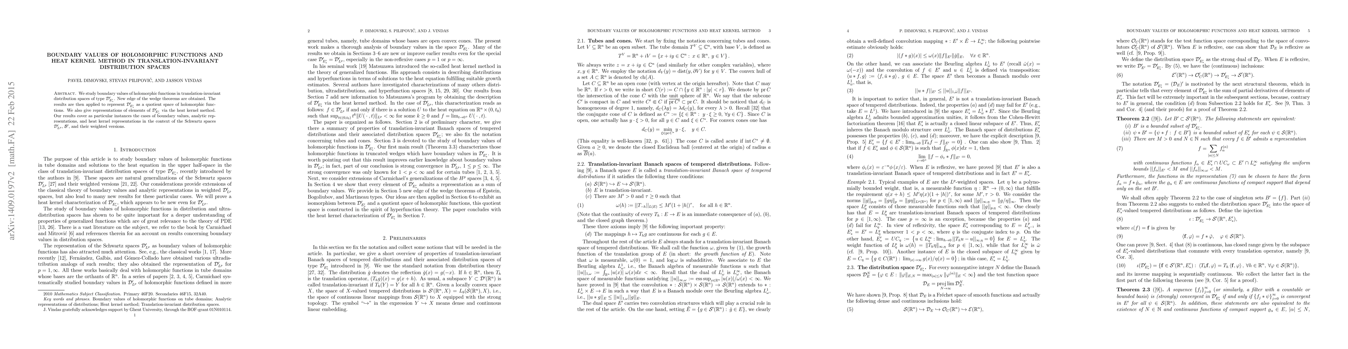 This paper investigates boundary values of holomorphic functions in translation-invariant distribution spaces, specifically $\mathcal{D}'_{E'_{\ast}}$, deriving new edge of the wedge theorems and representing $\mathcal{D}'_{E'_{\ast}}$ as a quotient space of holomorphic functions. It also utilizes the heat kernel method to provide representations of elements in this space.