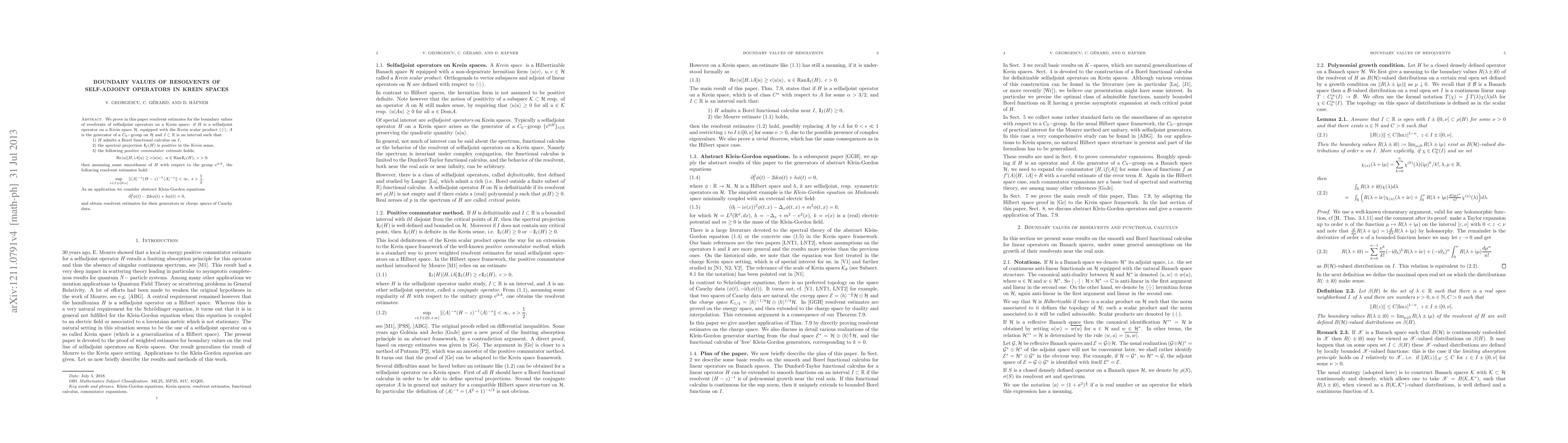 We prove in this paper resolvent estimates for the boundary values of resolvents of selfadjoint operators on a Krein space: if $H$ is a selfadjoint operator on a Krein space $\cH$, equipped with the Krein scalar product $\langle \cdot| \cdot \rangle$, $A$ is the generator of a $C_{0}-$group on $\cH$ and $I\subset \rr$ is an interval such that: \begin{itemize} \item[]1) $H$ admits a Borel functional calculus on $I$, \item[]2) the spectral projection $\one_{I}(H)$ is positive in the Krein sense, \item[]3) the following {\em positive commutator estimate} holds: \[ \Re \langle u| [H, \i A]u\rangle\geq c \langle u| u\rangle, \ u \in {\rm Ran}\one_{I}(H), \ c>0. \] \end{itemize} then assuming some smoothness of $H$ with respect to the group $\e^{\i t A}$, the following resolvent estimates hold: \[ \sup_{z\in I\pm \i]0, \nu]}\| \langle A\rangle ^{-s}(H-z)^{-1}\langle A\rangle^{-s}\| <\infty, \ s>\12. \] As an application we consider abstract Klein-Gordon equations \[ \p_{t}^{2}\phi(t)- 2 \i k \phi(t)+ h\phi(t)=0, \] and obtain resolvent estimates for their generators in {\em charge spaces} of Cauchy data.