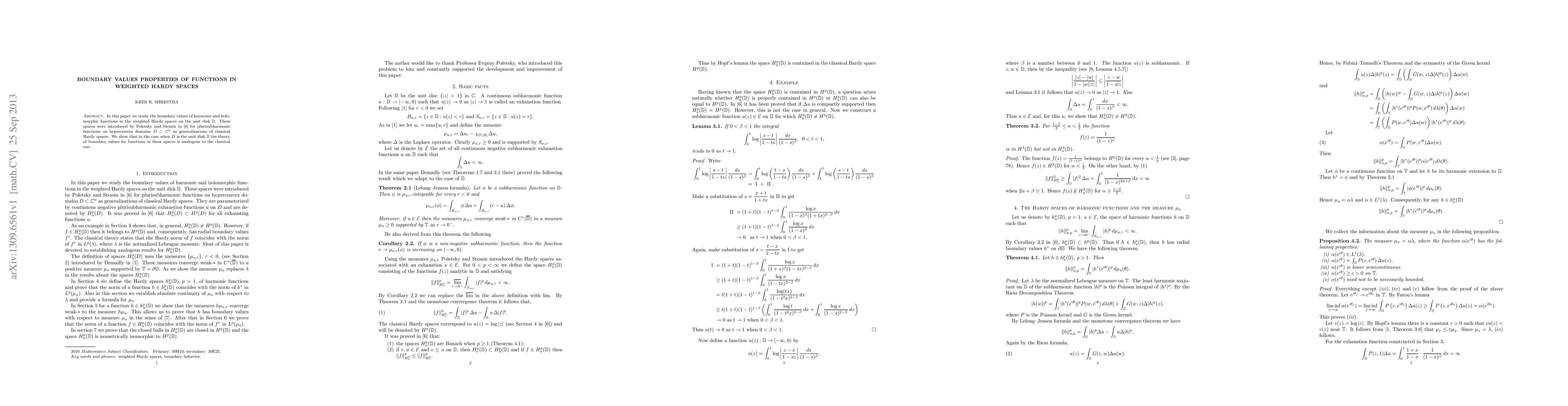 This paper investigates the boundary values of harmonic and holomorphic functions in weighted Hardy spaces on the unit disk $\mathbb{D}$, demonstrating that their boundary theory parallels the classical Hardy space theory. The study is based on the generalizations introduced by Poletsky and Stessin for plurisubharmonic functions on hyperconvex domains.