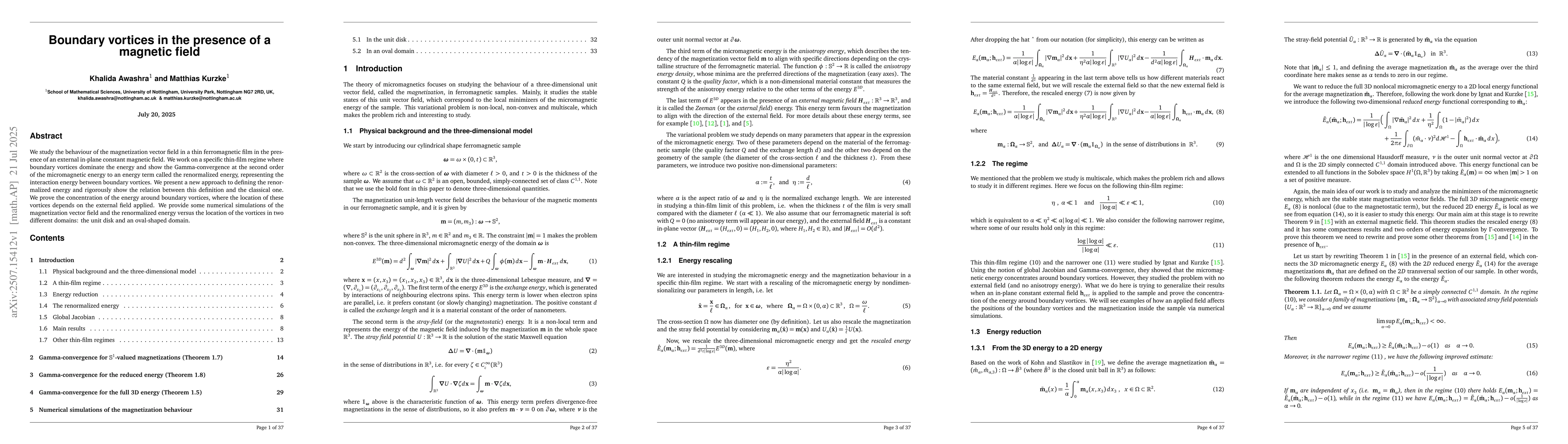 We study the behaviour of the magnetization vector field in a thin ferromagnetic film in the presence of an external in-plane constant magnetic field. We work on a specific thin-film regime where boundary vortices dominate the energy and show the Gamma-convergence at the second order of the micromagnetic energy to an energy term called the renormalized energy, representing the interaction energy between boundary vortices. We present a new approach to defining the renormalized energy and rigorously show the relation between this definition and the classical one. We prove the concentration of the energy around boundary vortices, where the location of these vortices depends on the external field applied. We provide some numerical simulations of the magnetization vector field and the renormalized energy versus the location of the vortices in two different domains: the unit disk and an oval-shaped domain.