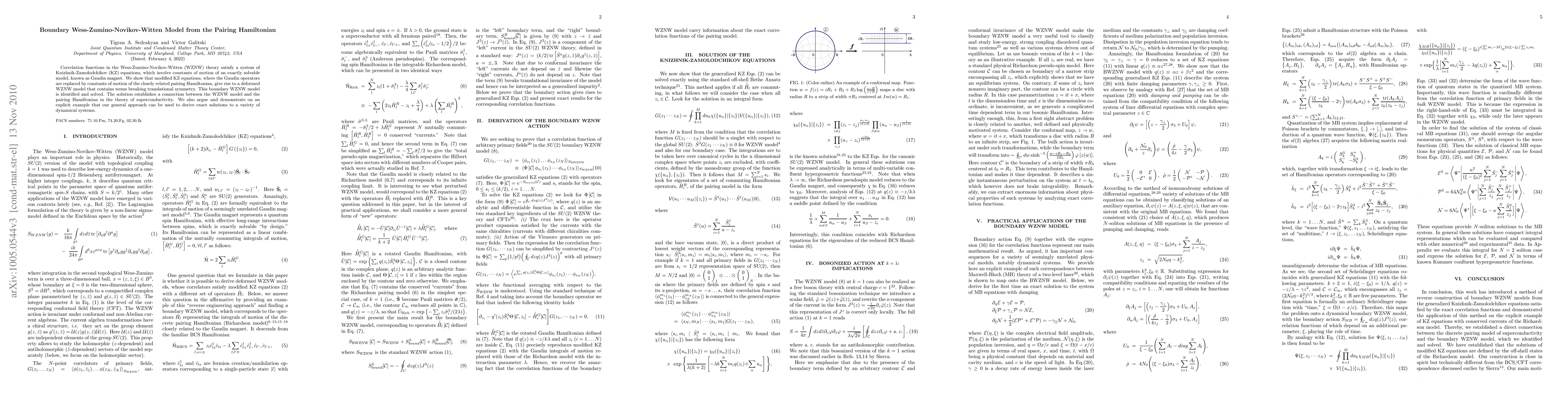 Correlation functions of primary fields in the Wess-Zumino-Novikov-Witten (WZNW) model are known to satisfy a system of Knizhnik-Zamolodchikov (KZ) equations, which involve constants of motion of the exactly-solvable Gaudin magnet. We modify the KZ equations by replacing these Gaudin operators with constants of motion of the closely-related Richardson pairing Hamiltonian and reconstruct a deformed WZNW model, whose correlators satisfy these equations. This modified theory, dubbed here the boundary WZNW model, contains a term that breaks translational symmetry and therefore represents a generalized boundary operator. The corresponding correlators of the boundary WZNW model are calculated and are shown to acquire exponential prefactors, in contrast to the bulk WZNW theories. The solution also establishes a connection between correlation functions of the WZNW model and the spectrum of the reduced pairing Hamiltonian.
