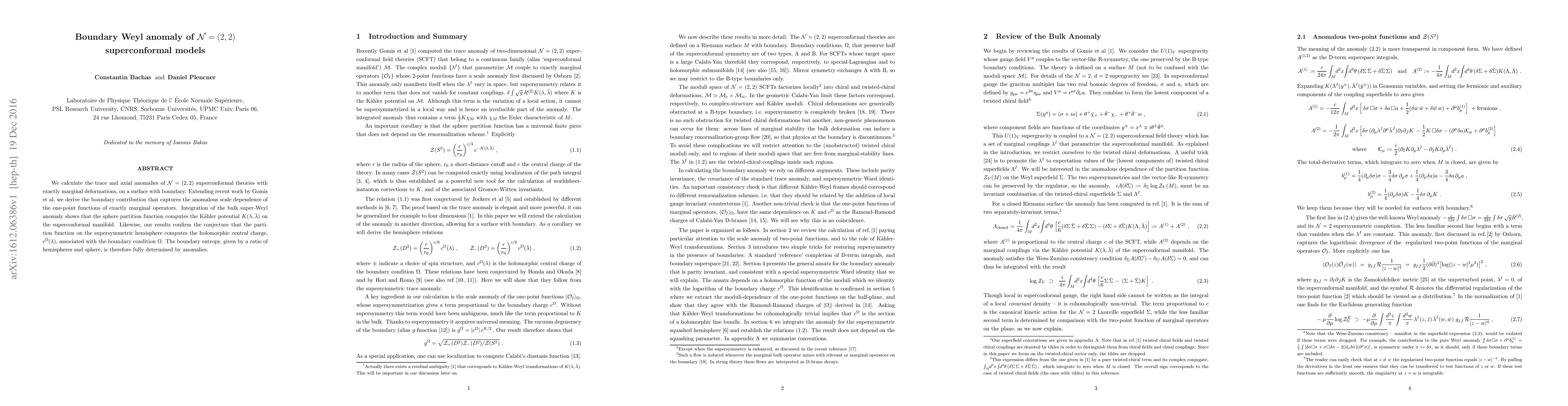 This research derives boundary Weyl anomaly for N=(2,2) superconformal theories with marginal deformations, calculating trace and axial anomalies. It confirms that the sphere partition function determines the Kähler potential on the superconformal manifold and that the hemisphere partition function computes the holomorphic central charge, fully determining boundary entropy via anomaly integration.