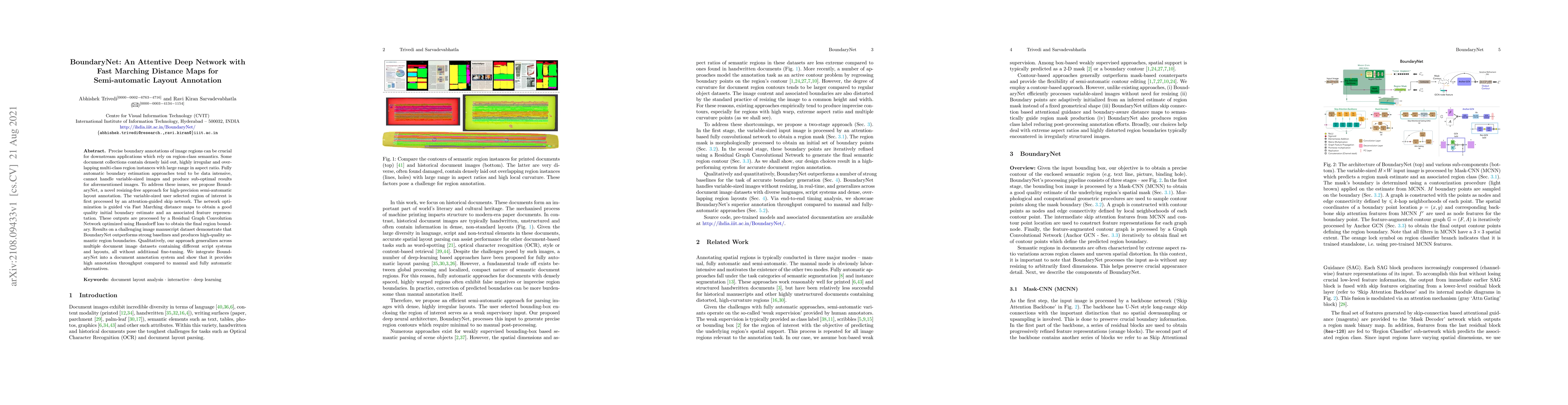 BoundaryNet is an attentive deep network that uses Fast Marching distance maps for high-precision semi-automatic layout annotation of complex document images. It achieves superior results compared to fully automatic methods, offering high annotation throughput and generalization across diverse document layouts.