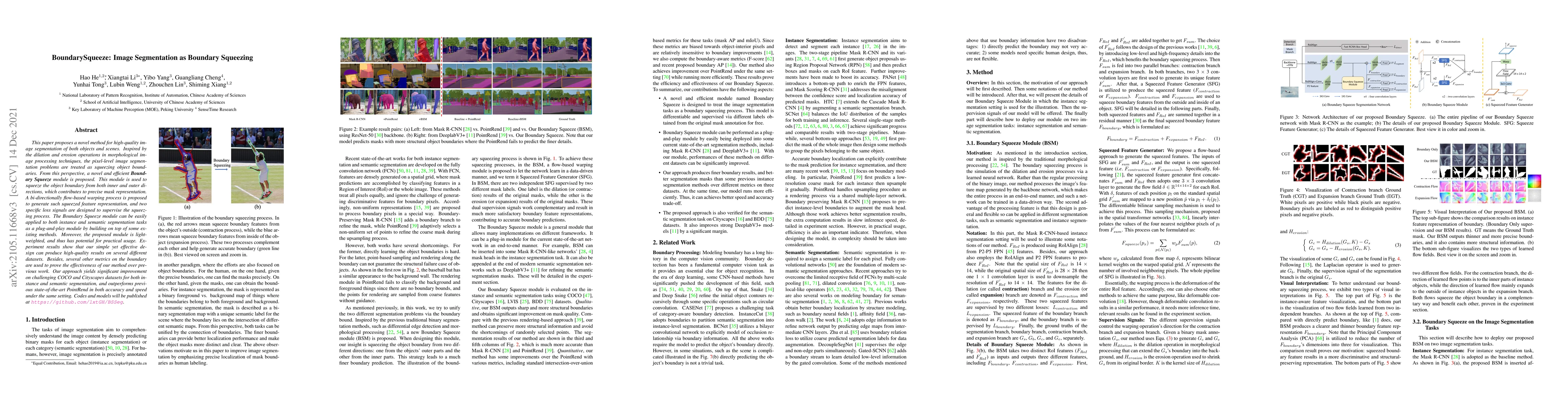 A new image segmentation method called Boundary Squeeze is proposed, which uses a novel module to squeeze object boundaries for precise mask representation, outperforming previous work on challenging datasets.