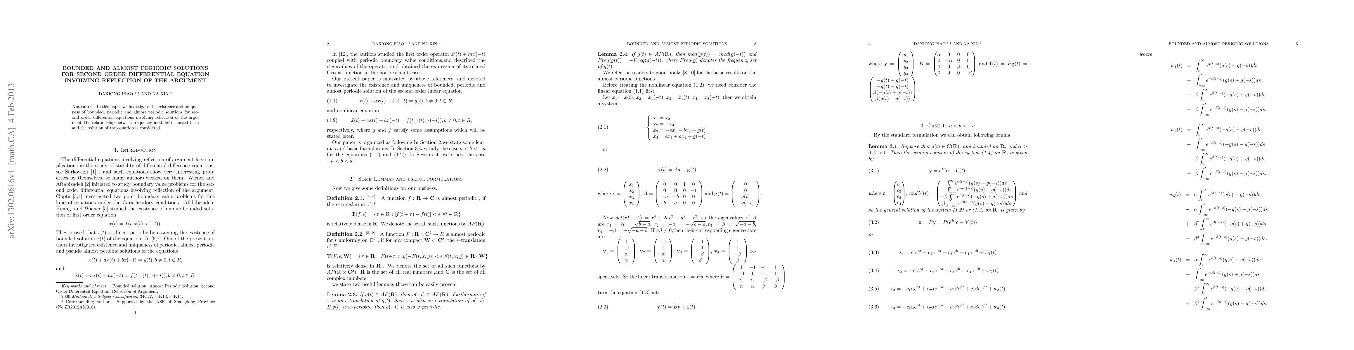 This paper investigates the existence and uniqueness of bounded, periodic, and almost periodic solutions for second-order differential equations with reflection of the argument. It focuses on the relationship between frequency modules of the forced term and the solution.