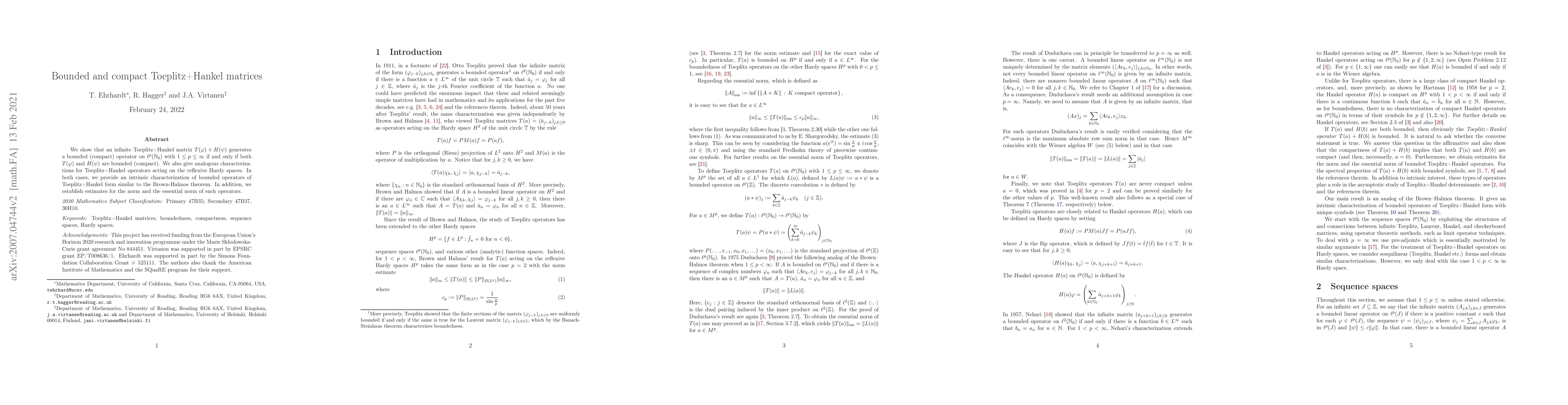 We show that an infinite Toeplitz+Hankel matrix $T(\varphi) + H(\psi)$ generates a bounded (compact) operator on $\ell^p(\mathbb{N}_0)$ with $1\leq p\leq \infty$ if and only if both $T(\varphi)$ and $H(\psi)$ are bounded (compact). We also give analogous characterizations for Toeplitz+Hankel operators acting on the reflexive Hardy spaces. In both cases, we provide an intrinsic characterization of bounded operators of Toeplitz+Hankel form similar to the Brown-Halmos theorem. In addition, we establish estimates for the norm and the essential norm of such operators.