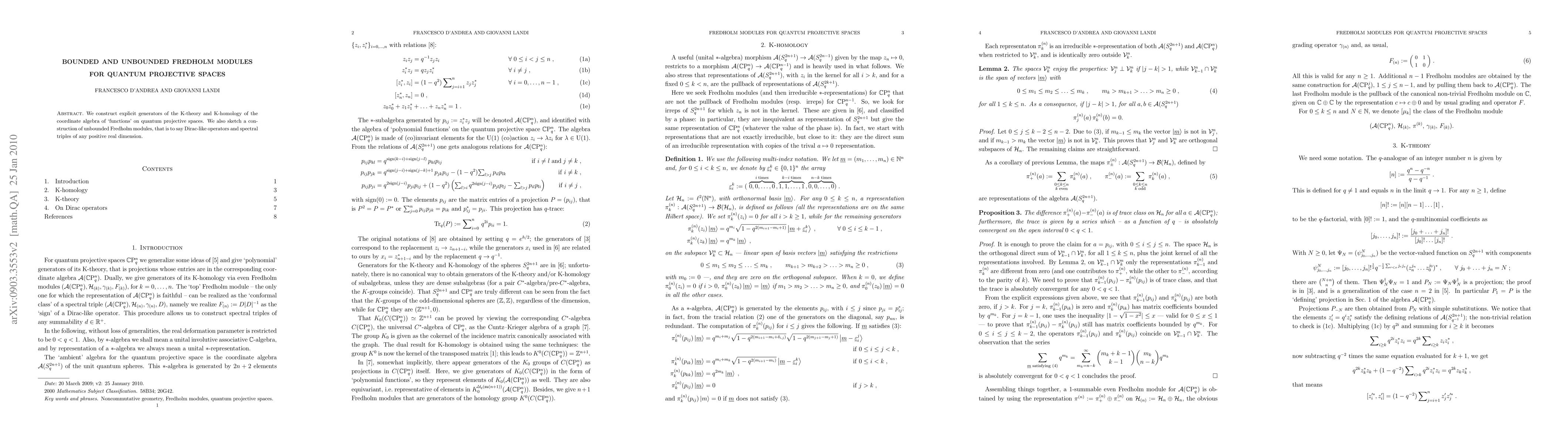 This paper constructs explicit generators for the K-theory and K-homology of quantum projective spaces' coordinate algebra and introduces unbounded Fredholm modules, including Dirac-like operators and spectral triples of any positive dimension.
