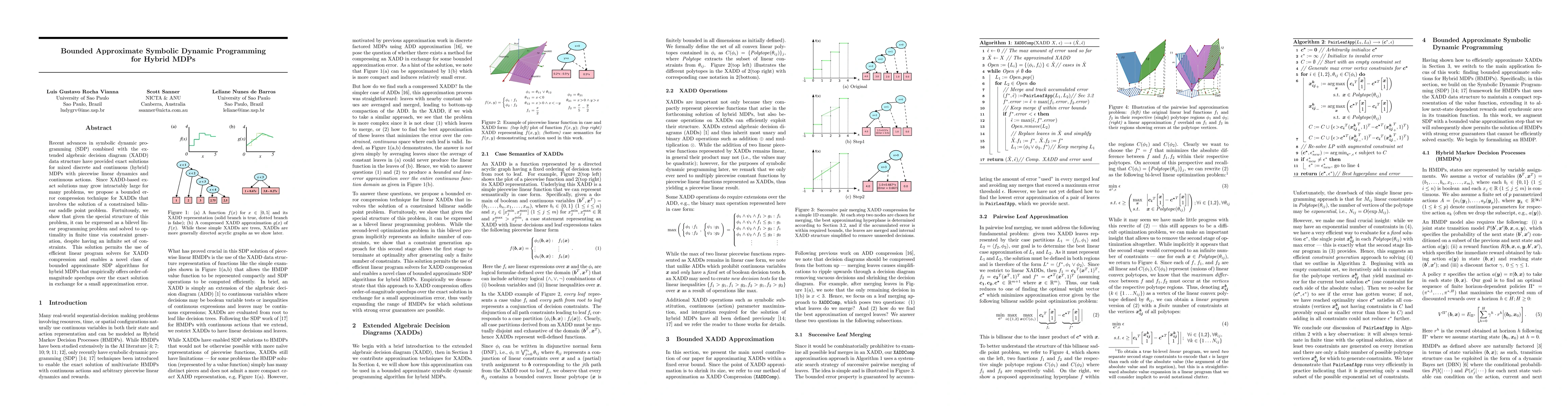 This paper proposes a bounded error compression technique for XADDs to manage the intractability of exact solutions for hybrid MDPs, leveraging a constrained bilinear saddle point problem expressed as a bilevel linear programming problem. This approach enables efficient linear program solvers and results in a novel class of bounded approximate SDP algorithms that provide significant speedups over exact solutions.