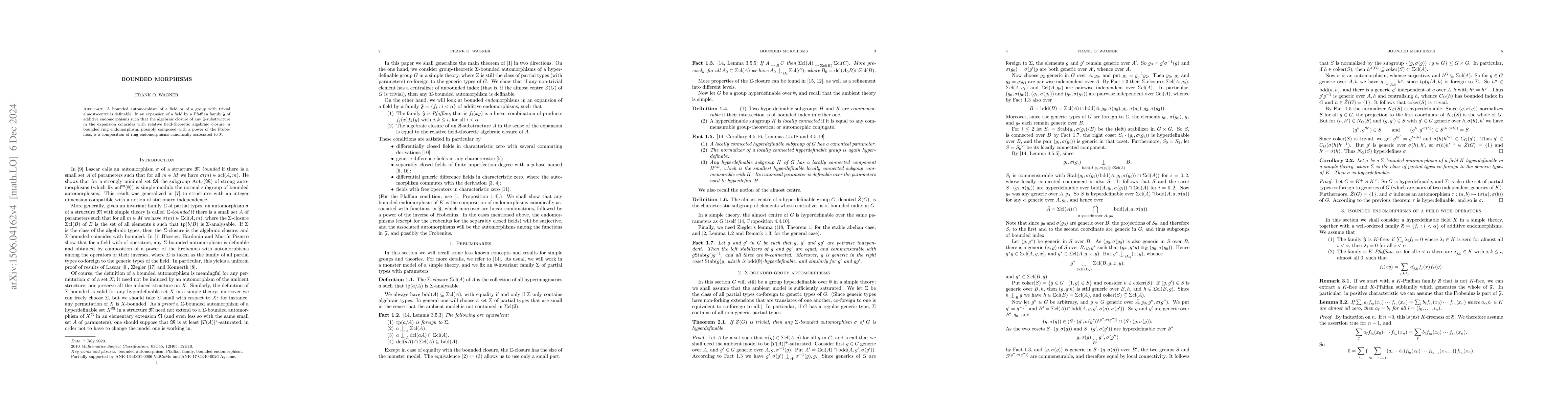 A bounded automorphism of a field or a group with trivial approximate centre is definable. In an expansion of a field by a Pfaffian family F of additive endomorphisms such that algebraic closure in the expansion coincides with relative field-algebraic closure of the F-substructure generated, a bounded endomorphism, possibly composed with a power of the Frobenius, is a composition of endomorphisms associated with F.