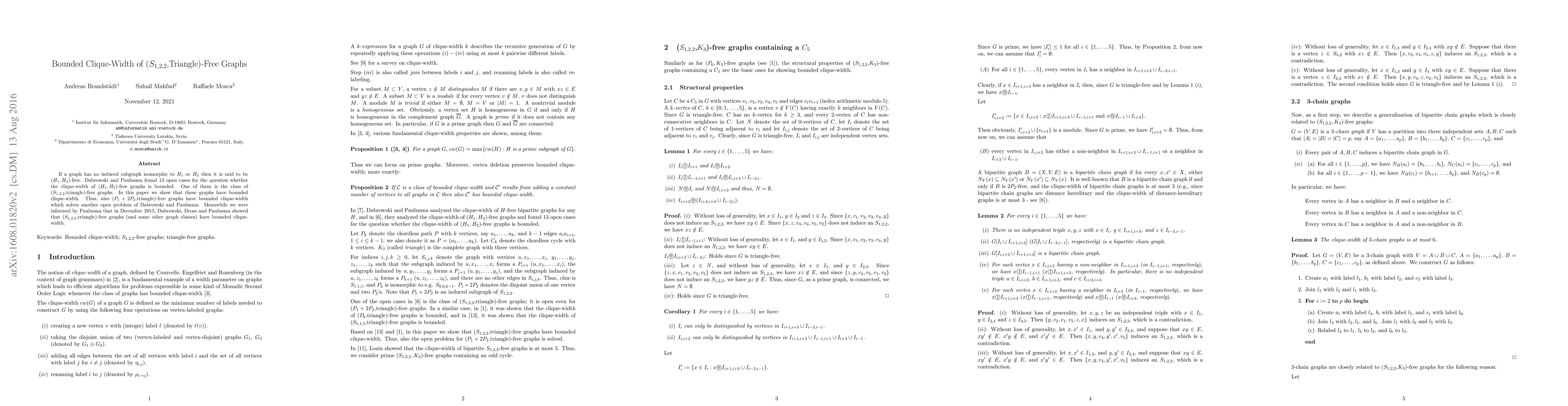 If a graph has no induced subgraph isomorphic to $H_1$ or $H_2$ then it is said to be ($H_1,H_2$)-free. Dabrowski and Paulusma found 13 open cases for the question whether the clique-width of ($H_1,H_2$)-free graphs is bounded. One of them is the class of ($S_{1,2,2}$,triangle)-free graphs. In this paper we show that these graphs have bounded clique-width. Thus, also ($P_1+2P_2$,triangle)-free graphs have bounded clique-width which solves another open problem of Dabrowski and Paulusma. Meanwhile we were informed by Paulusma that in December 2015, Dabrowski, Dross and Paulusma showed that ($S_{1,2,2}$,triangle)-free graphs (and some other graph classes) have bounded clique-width.