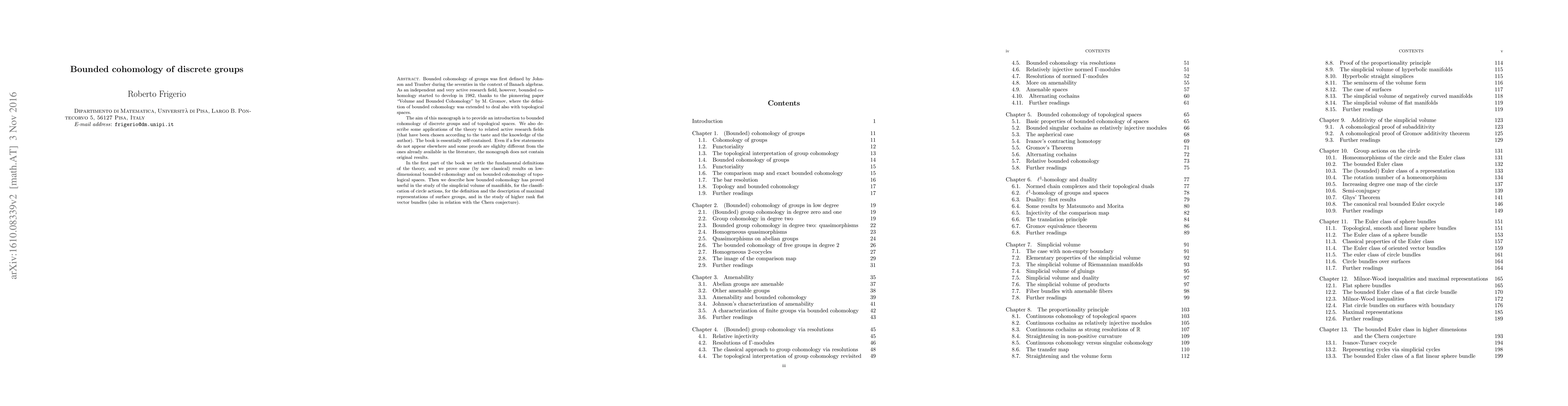 This monograph introduces bounded cohomology of discrete groups and topological spaces, detailing foundational definitions and classical results. It explores applications in simplicial volume, circle actions, maximal representations, and higher rank flat vector bundles, providing a self-contained overview without presenting original research.