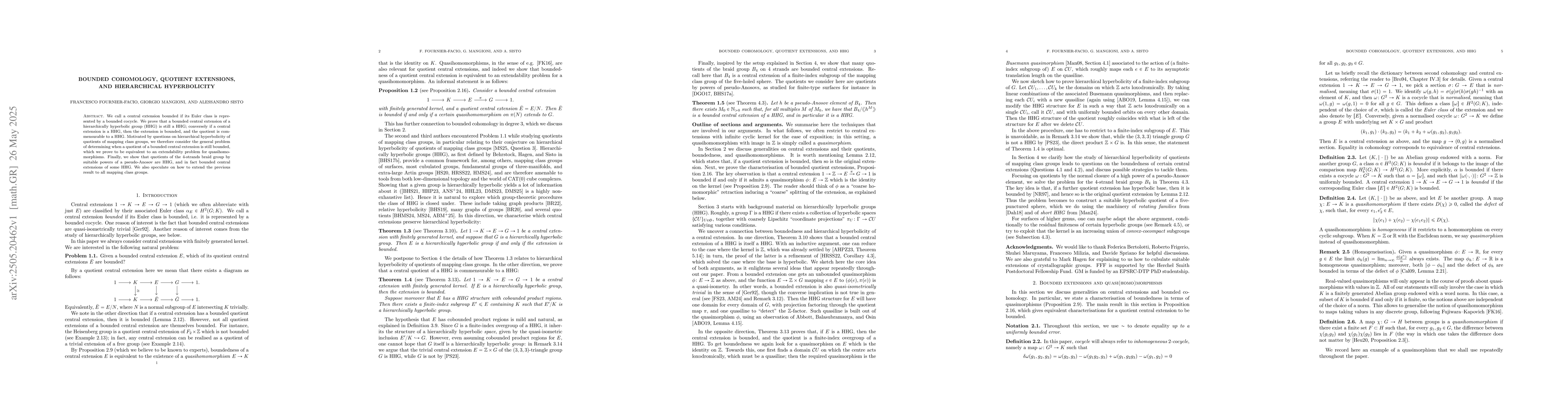 The paper establishes connections between bounded cohomology, quotient extensions, and hierarchical hyperbolicity, proving key theorems about central extensions of HHGs.