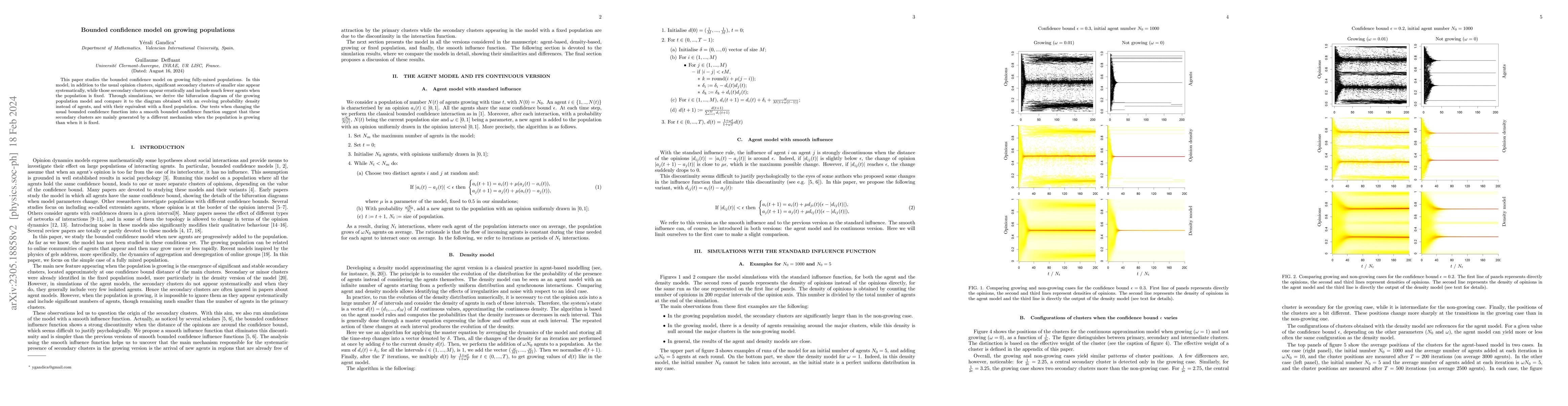 This paper investigates the bounded confidence model on growing populations, revealing the emergence of secondary opinion clusters. Simulations show that these clusters form differently in growing populations compared to fixed ones, suggesting a distinct mechanism at play.