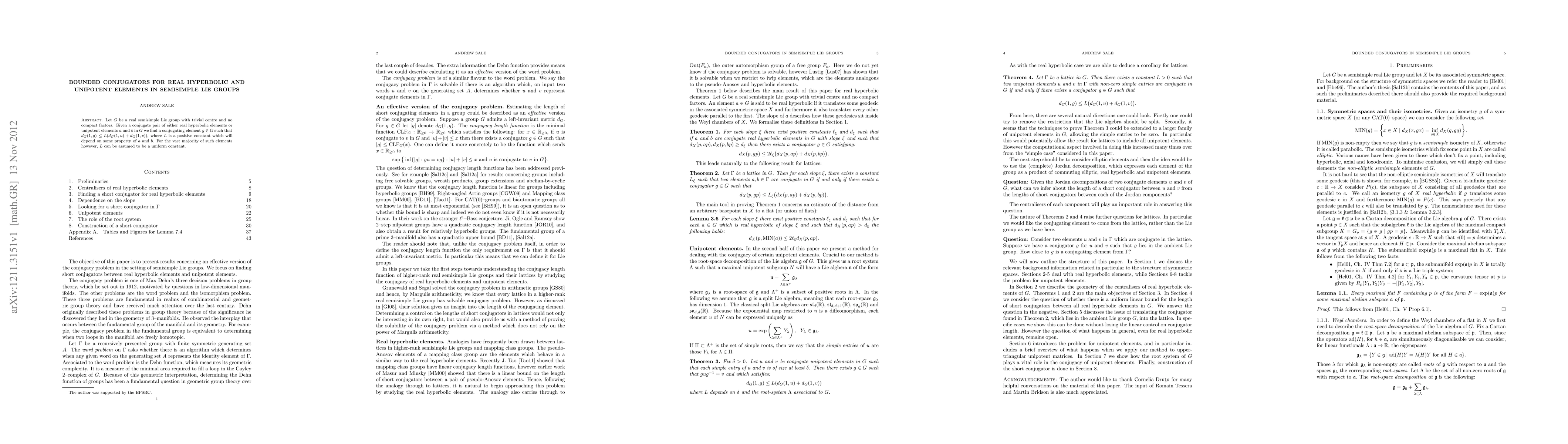 Let $G$ be a real semisimple Lie group with trivial centre and no compact factors. Given a conjugate pair of either real hyperbolic elements or unipotent elements $a$ and $b$ in $G$ we find a conjugating element $g \in G$ such that $d_G(1,g) \leq L(d_G(1,u)+d_G(1,v))$, where $L$ is a positive constant which will depend on some property of $a$ and $b$. For the vast majority of such elements however, $L$ can be assumed to be a uniform constant.